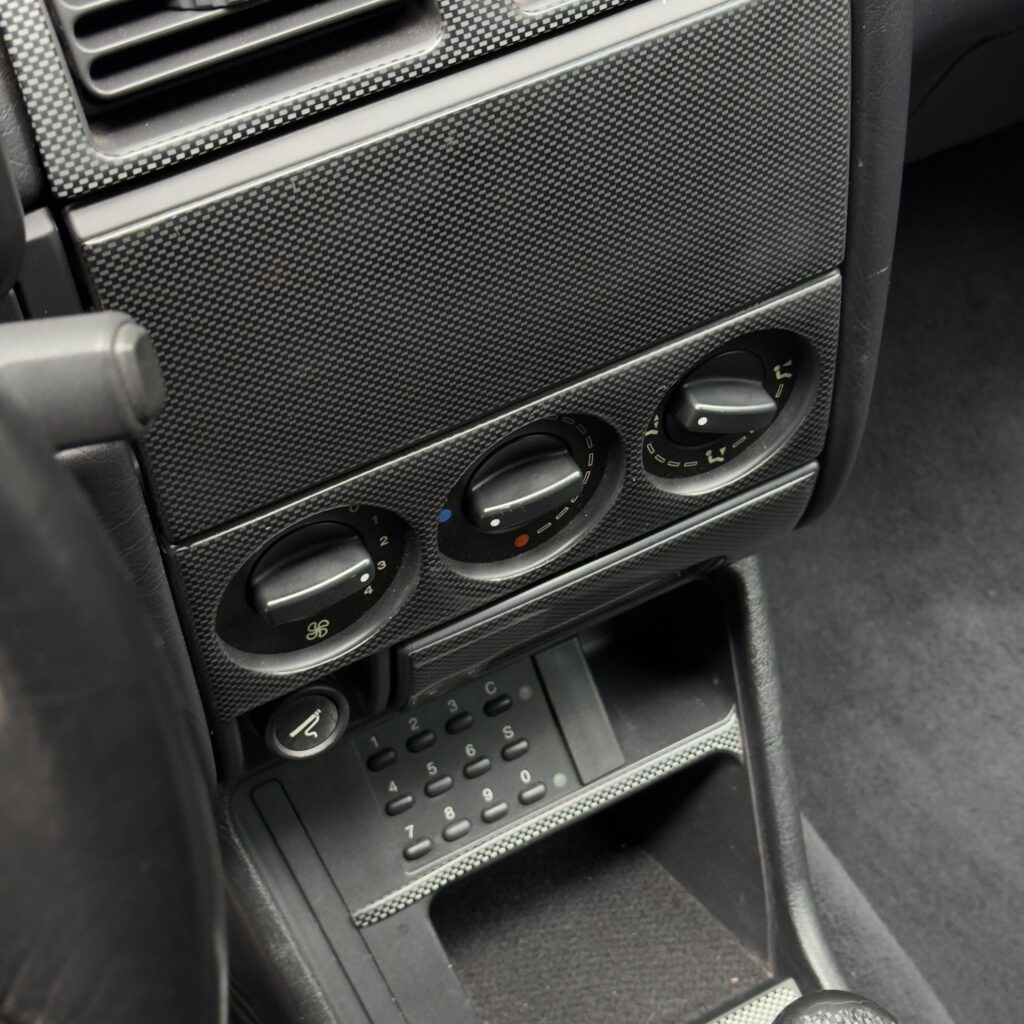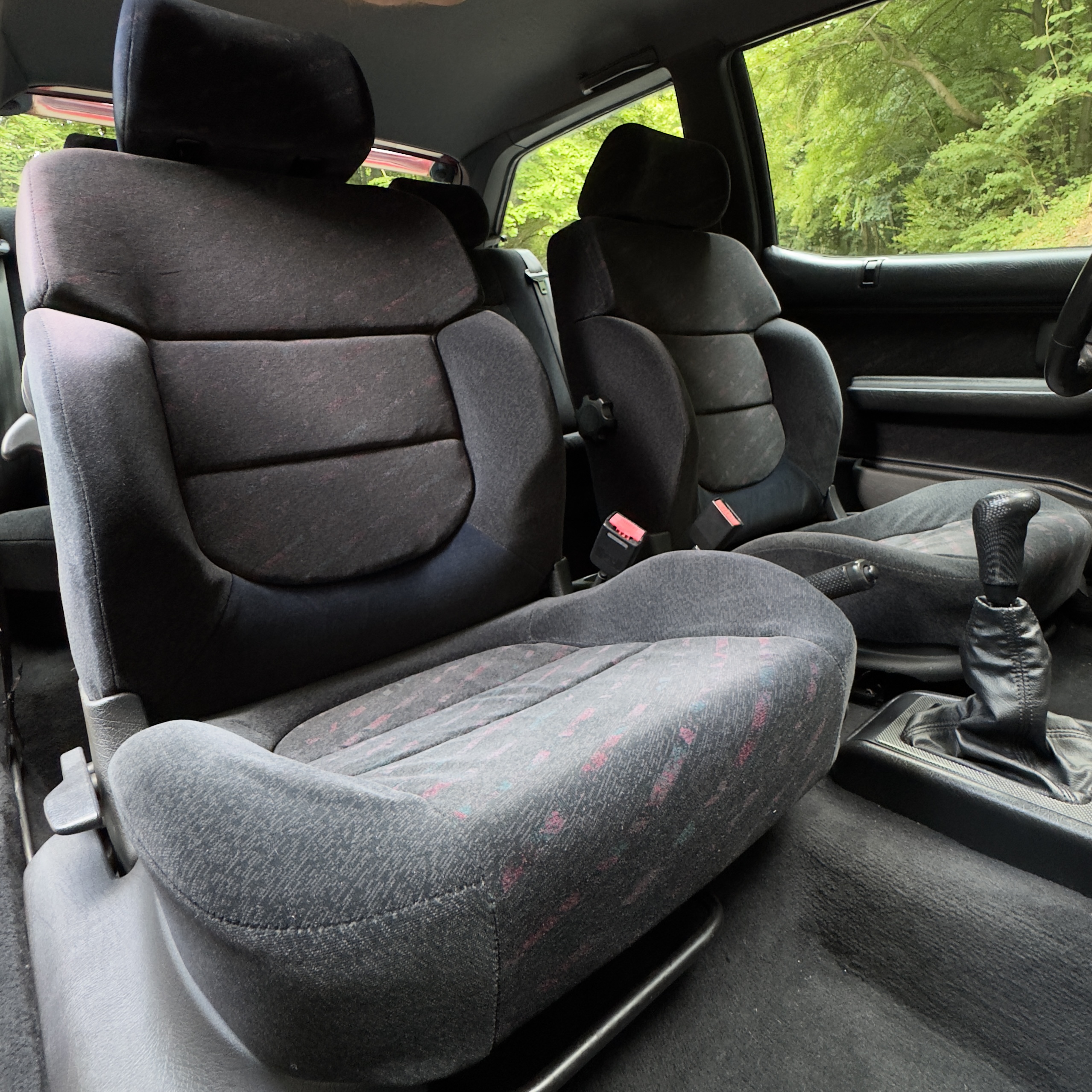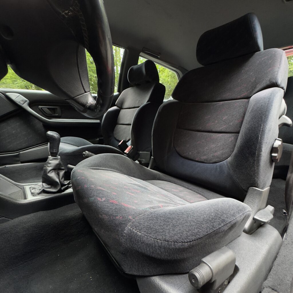 L’intérieur d’origine est très bien conservé. La sellerie tissu noire à motifs rouge et bleus est bien conservée pour le kilométrage de la voiture, le ciel de toit est propre, et le tableau de bord ainsi que le reste de l'habitacle sont en très bon état.