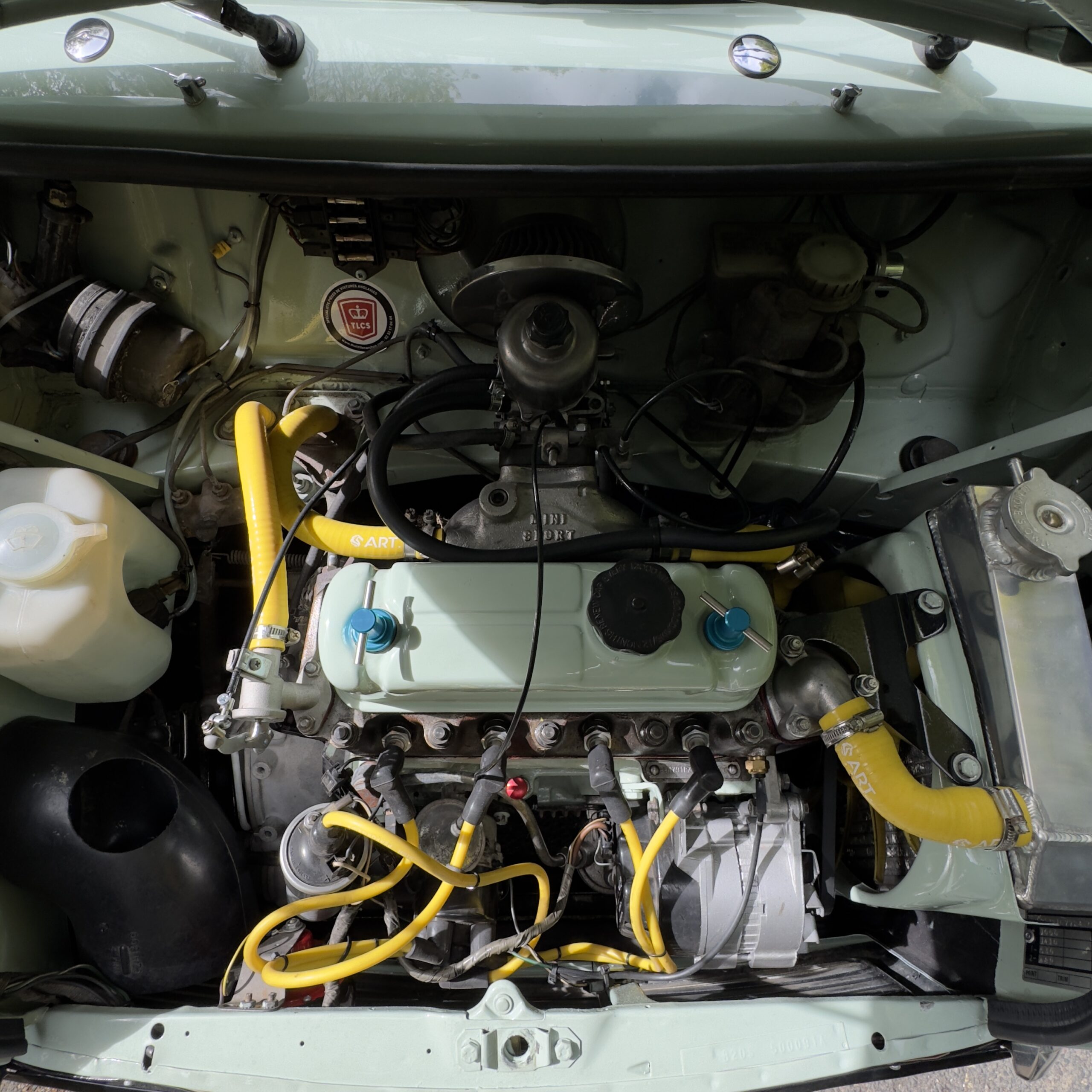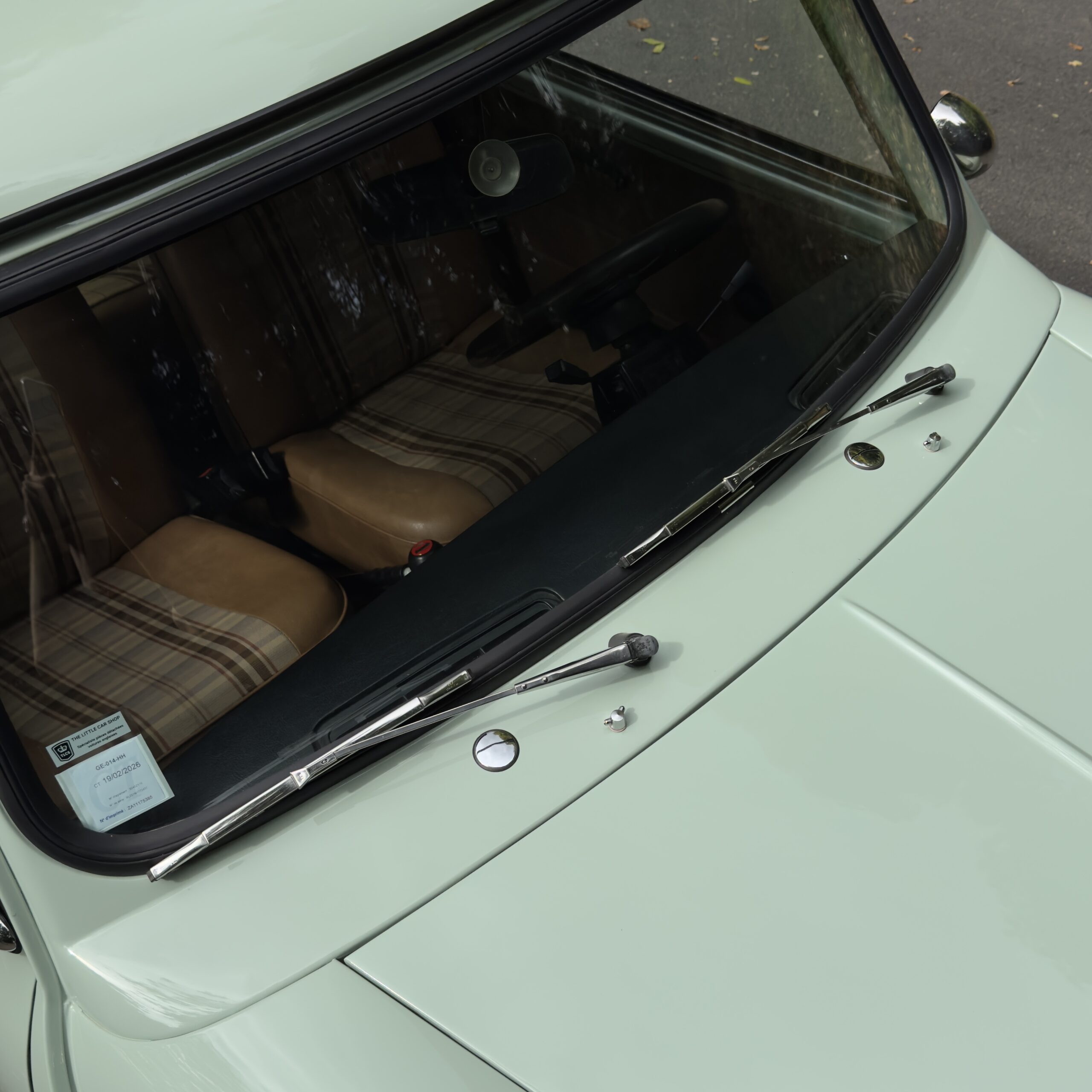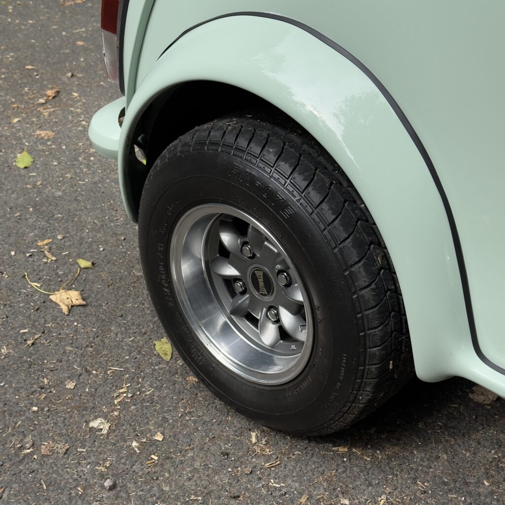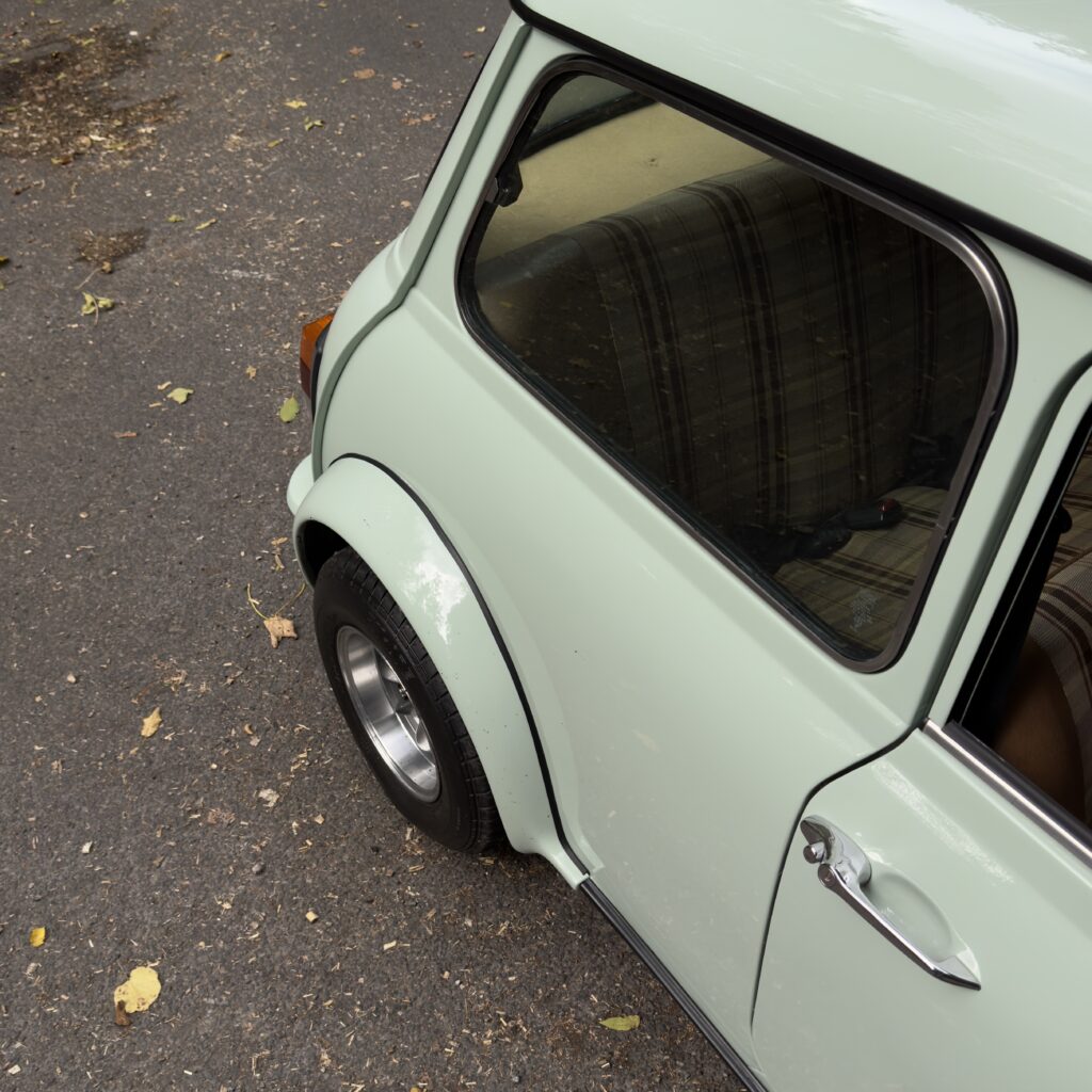 La Mini a bénéficié d'une peinture complète dans une superbe teinte Porcelain Green pastel, sublimée par la pose d’extensions d’ailes Sportpack Mini avec élargisseurs de voie, lui conférant une allure à la fois élégante et sportive.