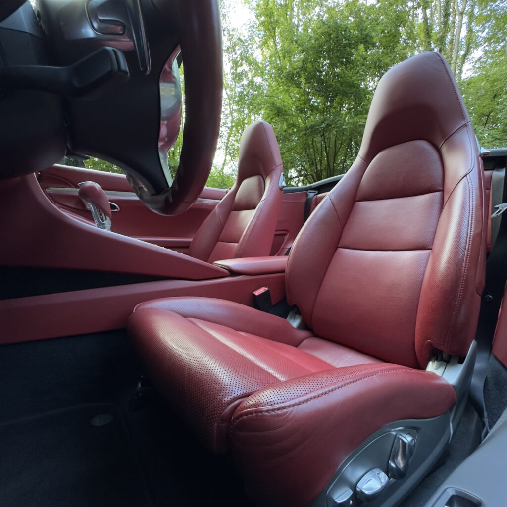 L’habitacle en cuir étendu rouge est remarquablement bien préservé, contrastant à merveille avec la carrosserie.