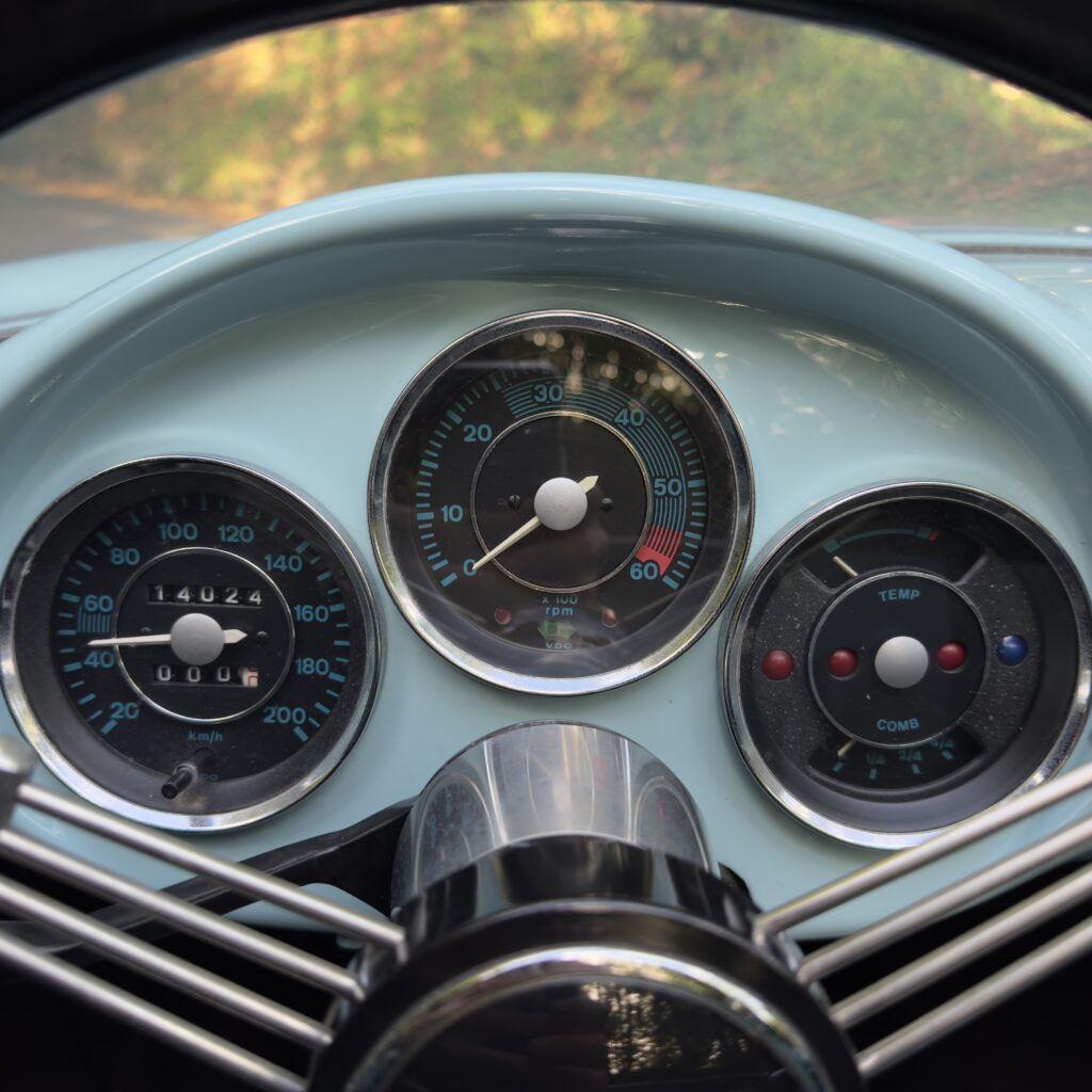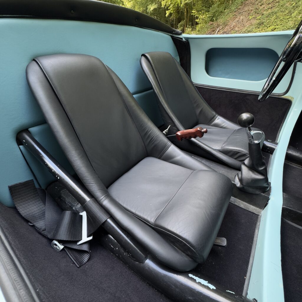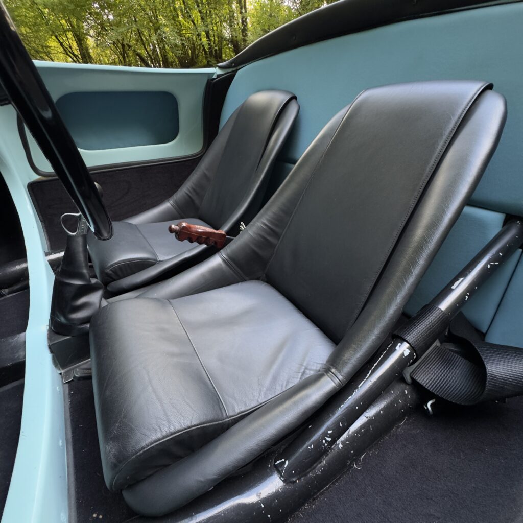 À l’intérieur, tout a été repris avec soin, la restauration de la sellerie a été confié à un professionnel, fidèle à l’esprit sportif du modèle, tout en restant confortable.