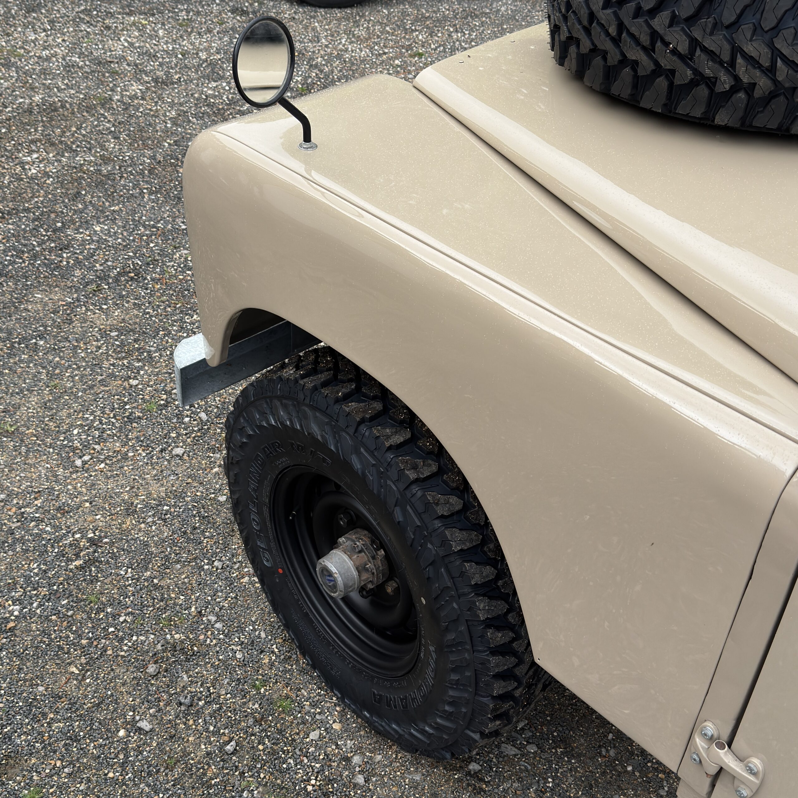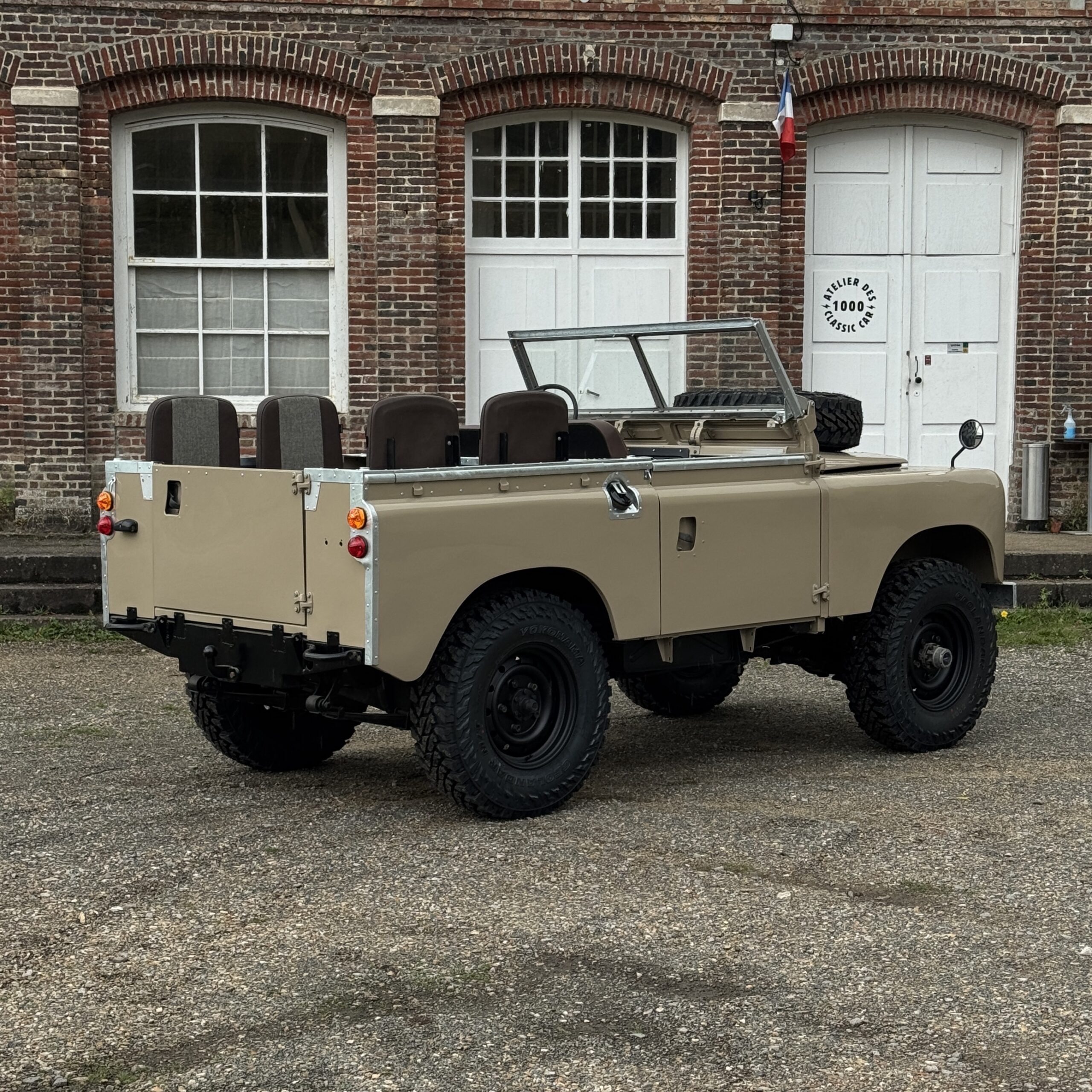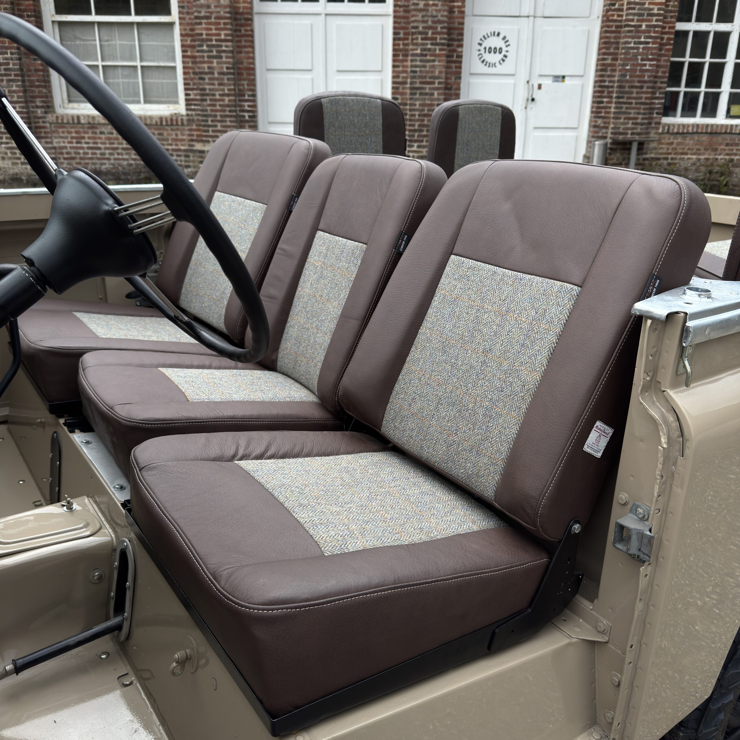 Avec cette teinte Sand, sa sellerie en cuir véritable Brown & Tweed et ses jantes Wolf noires chaussées de pneus de 285 , ce Serie 2A à été réstauré dans la plus pure tradition Land Rover tout en accentuant son look de baroudeur chic.