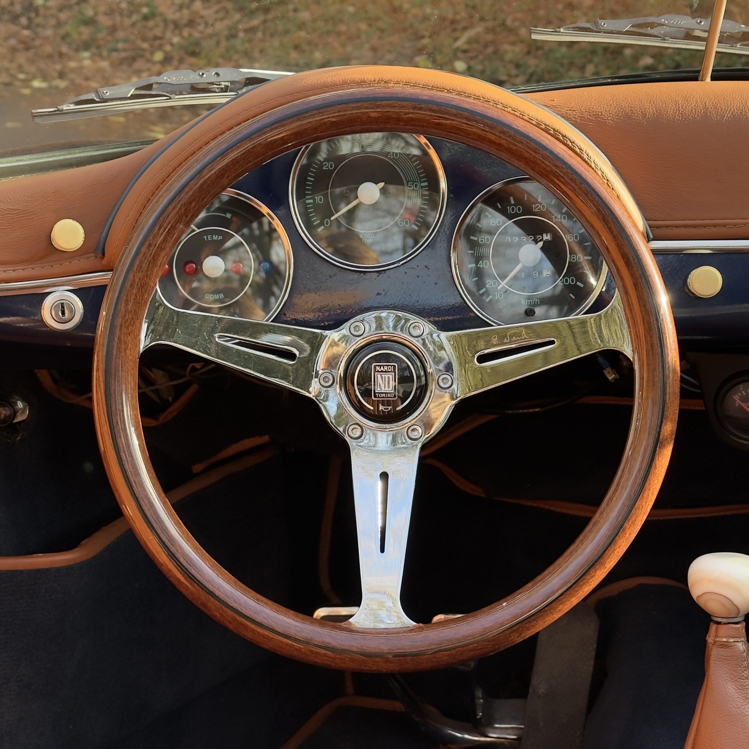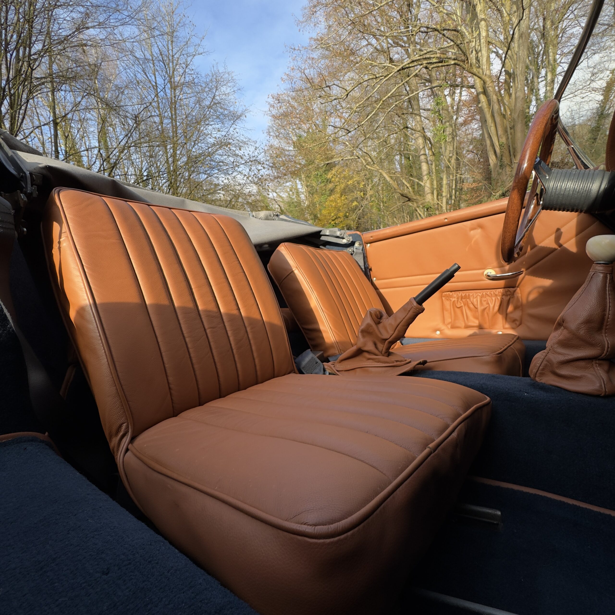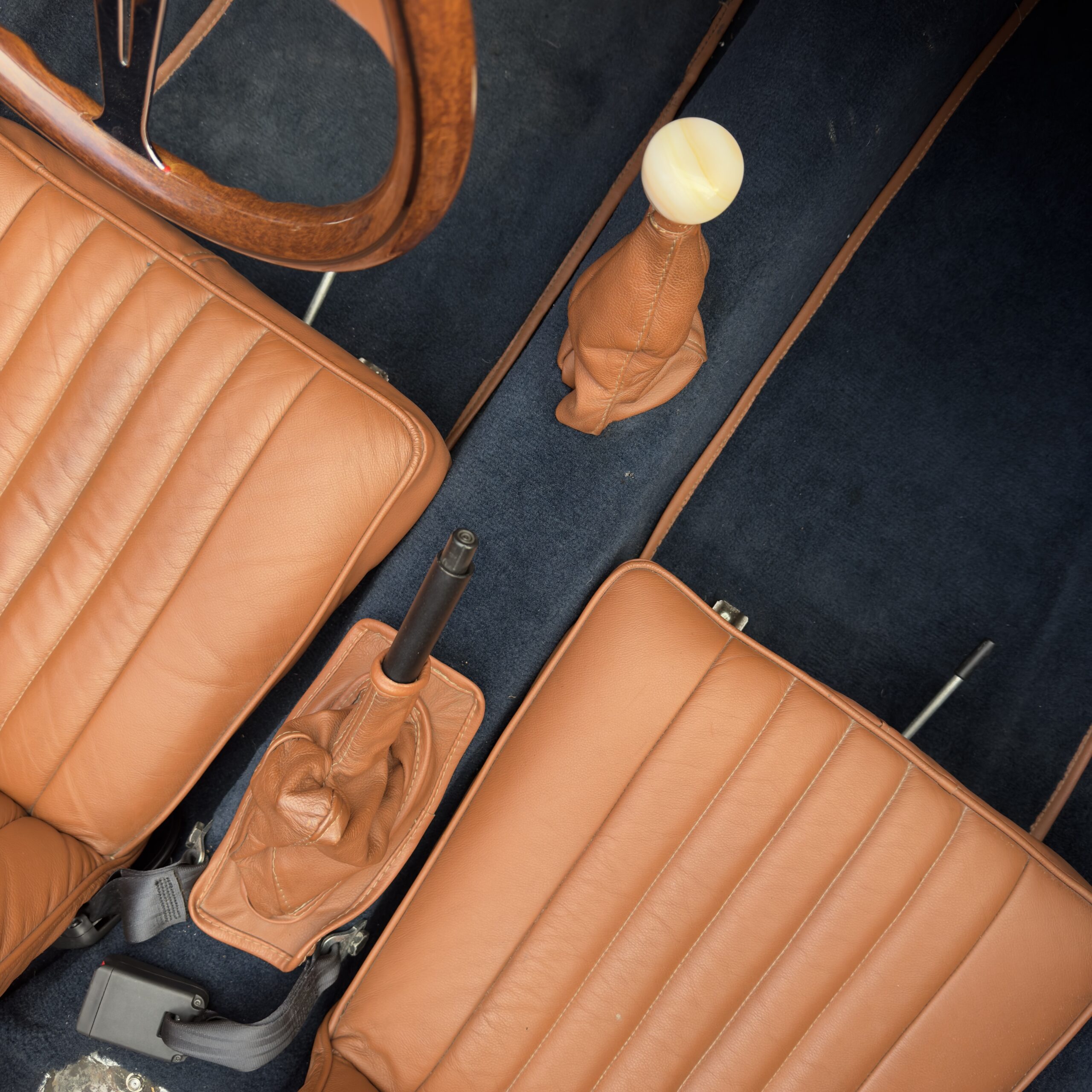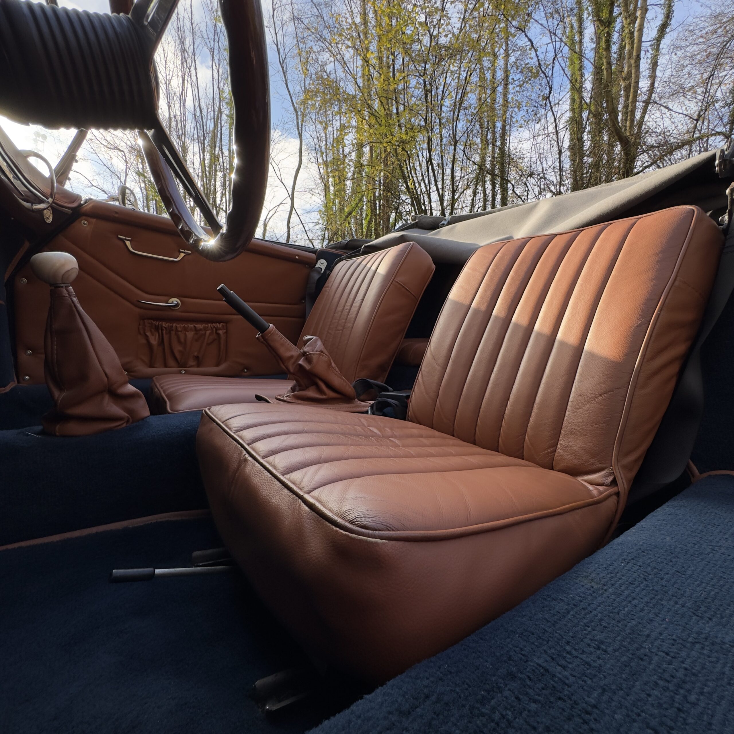 Les moquettes bleu avec passe poil marron assorties sont en excellent état également, et un volant bois Nardi vient apporté une touche sport-chic a cet habitacle.