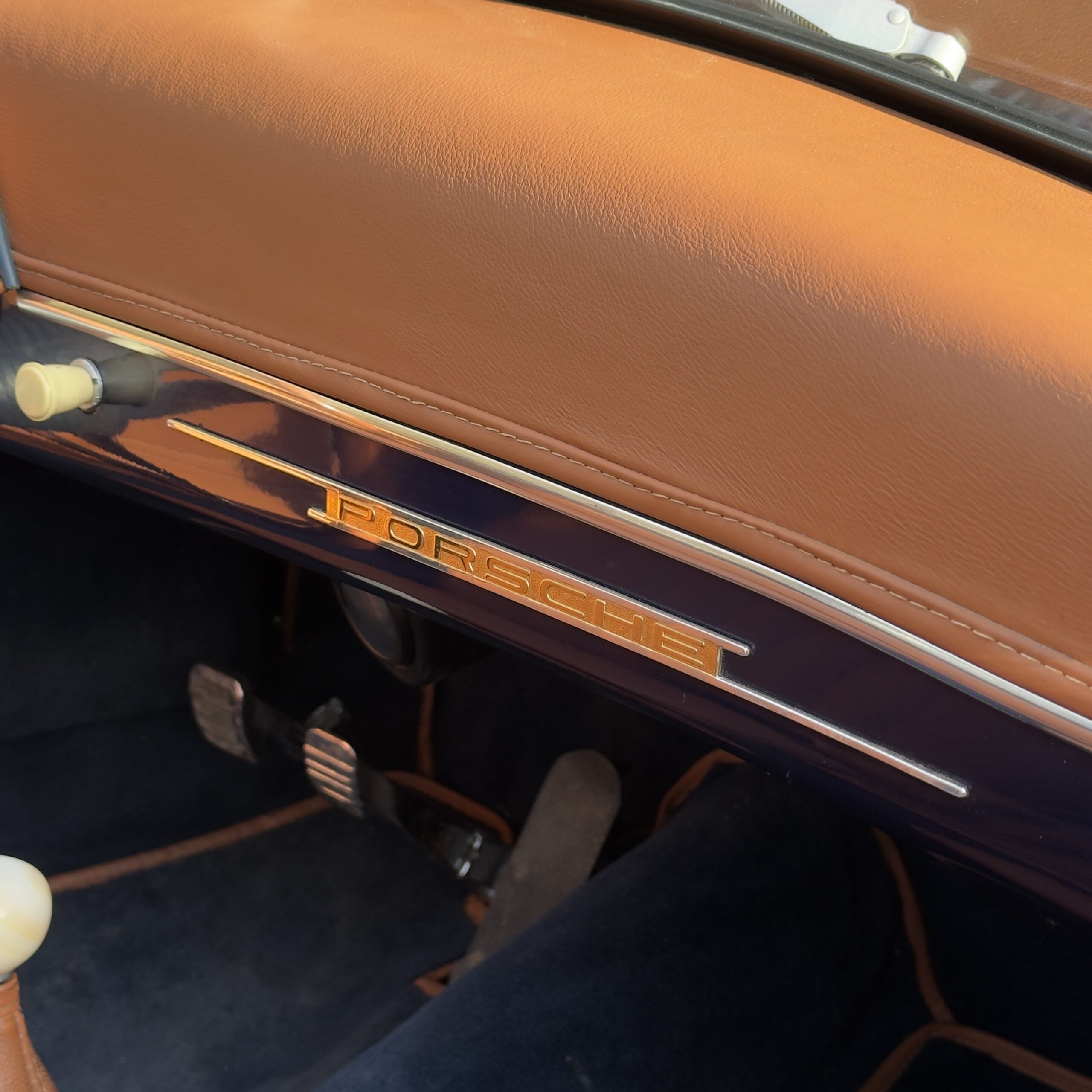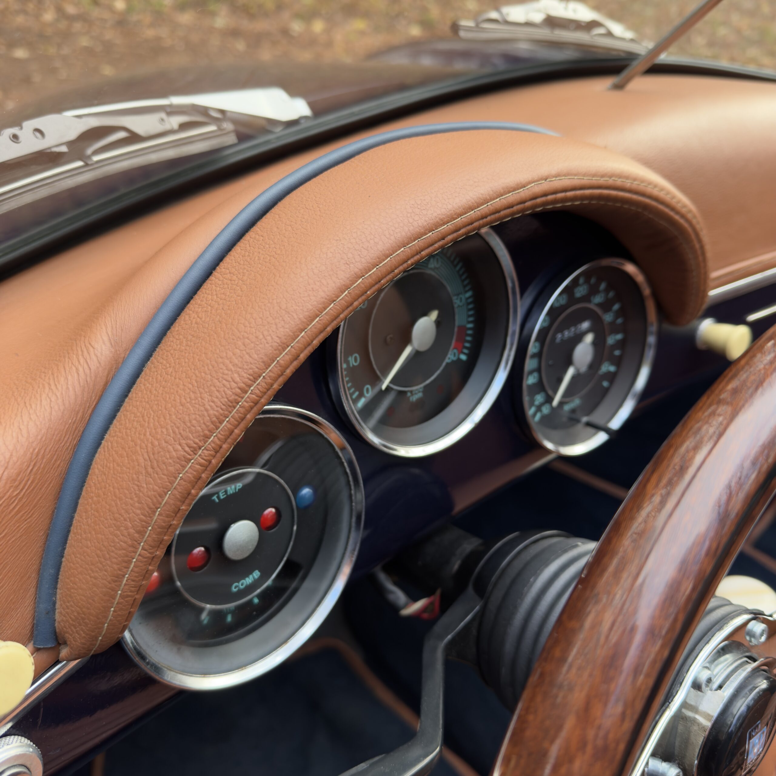 Une magnifique sellerie tan a été faites sur mesure pour l'habitacle, contrastant a merveilles avec les moquettes bleu assorties à la carrosserie.