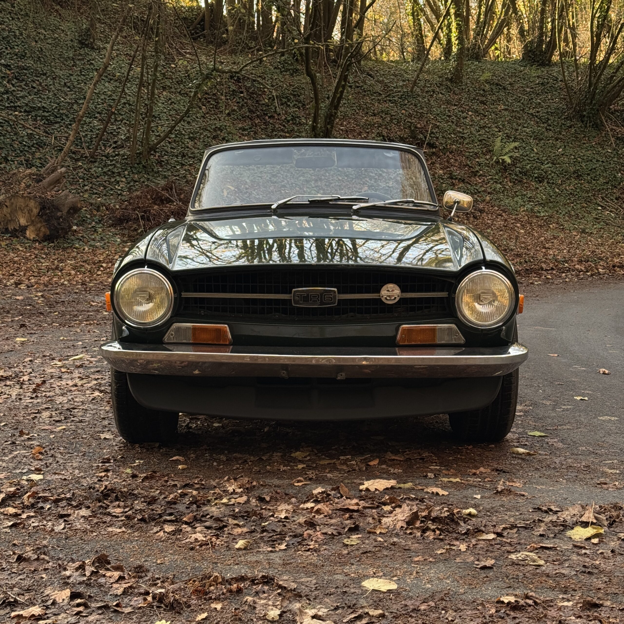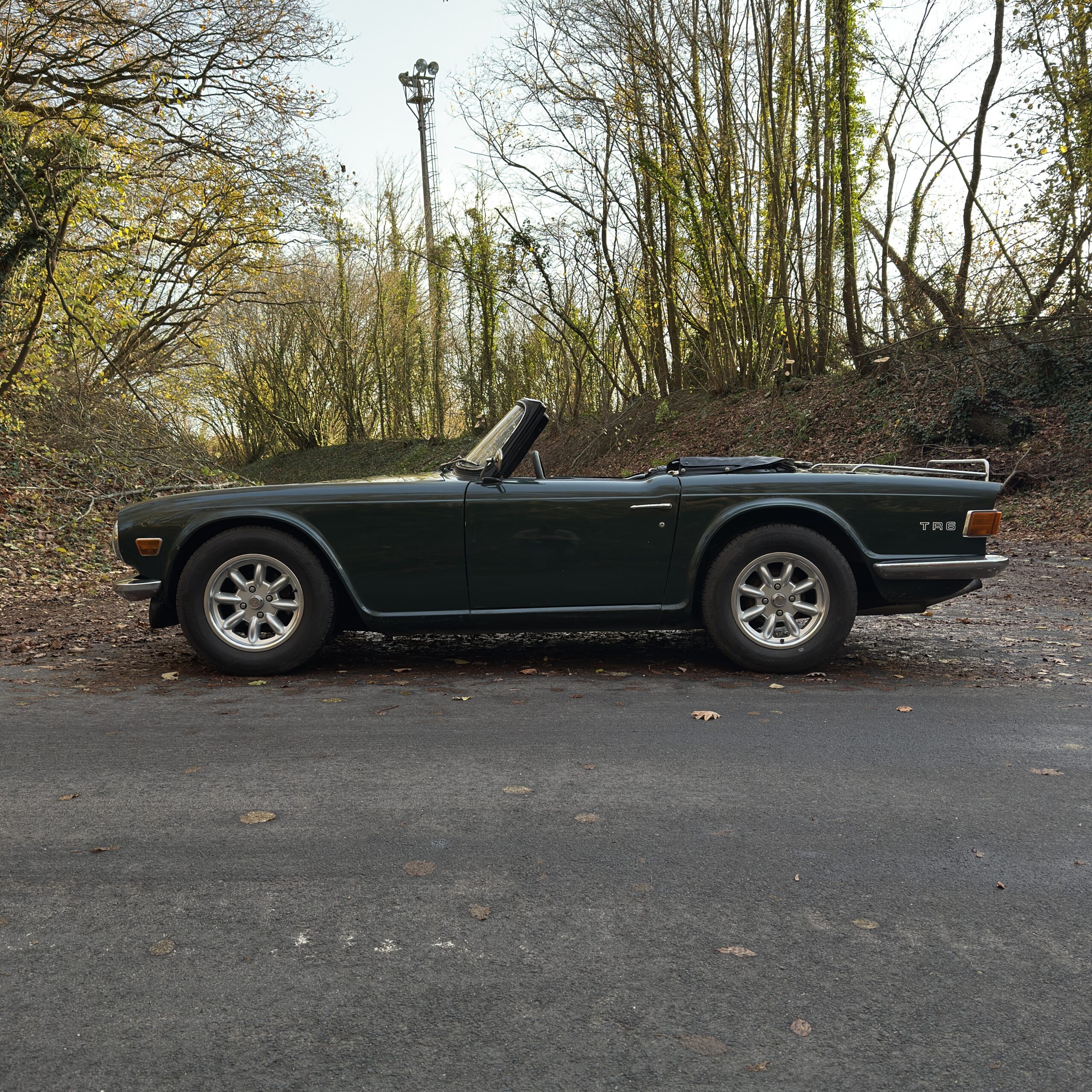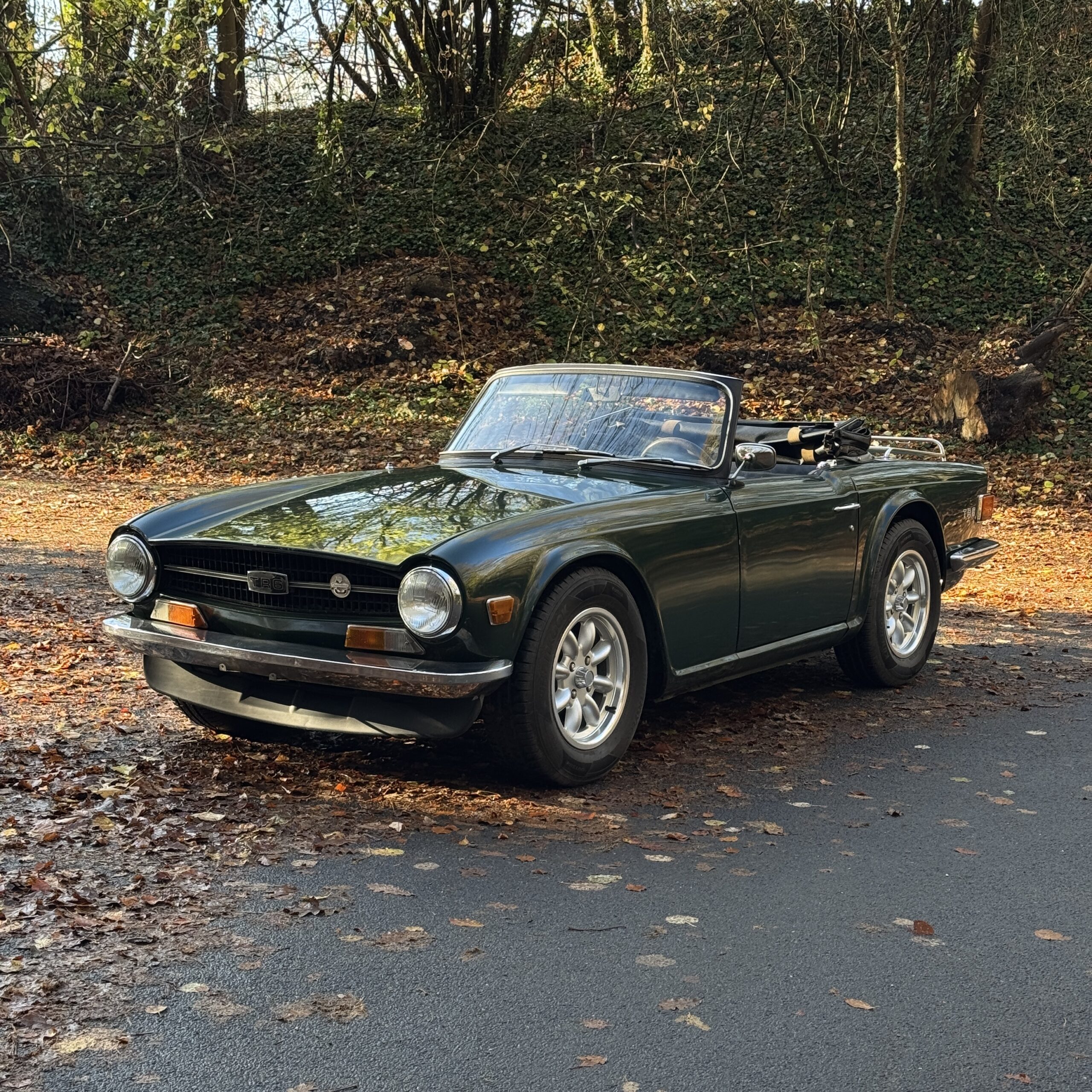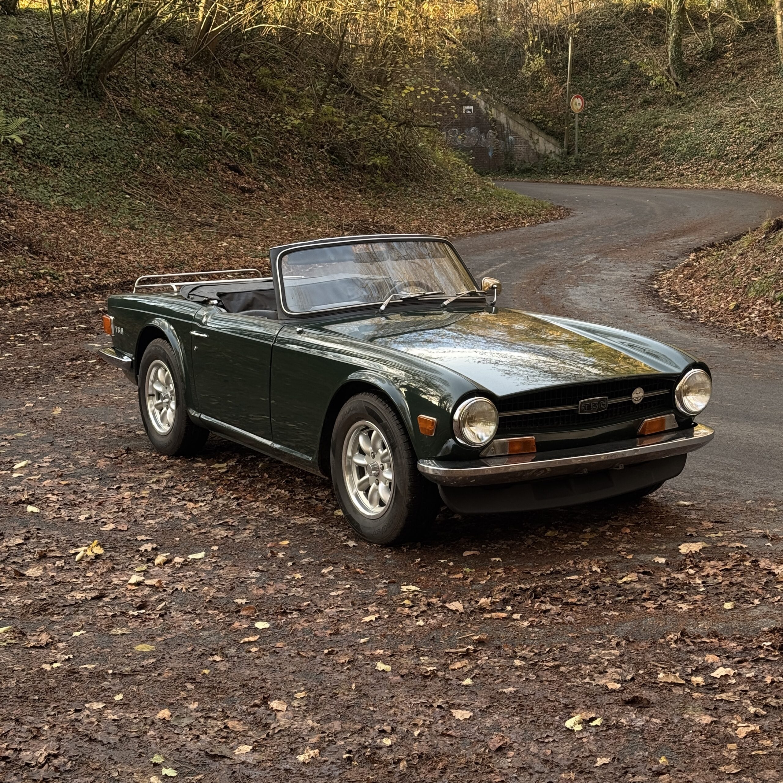 L’Atelier des 1000 a le plaisir de vous présenter aujourd’hui à la vente cette belle Triumph TR6 PI avec overdrive, dans une élégante configuration avec sa teinte British Racing Green, son intérieur en cuir noir véritable et sa capote assortie.