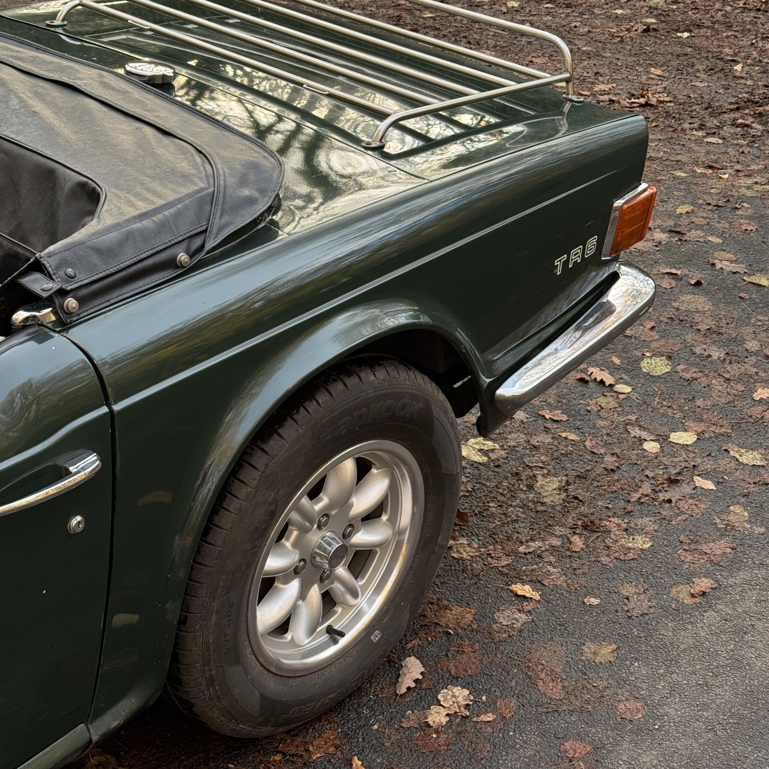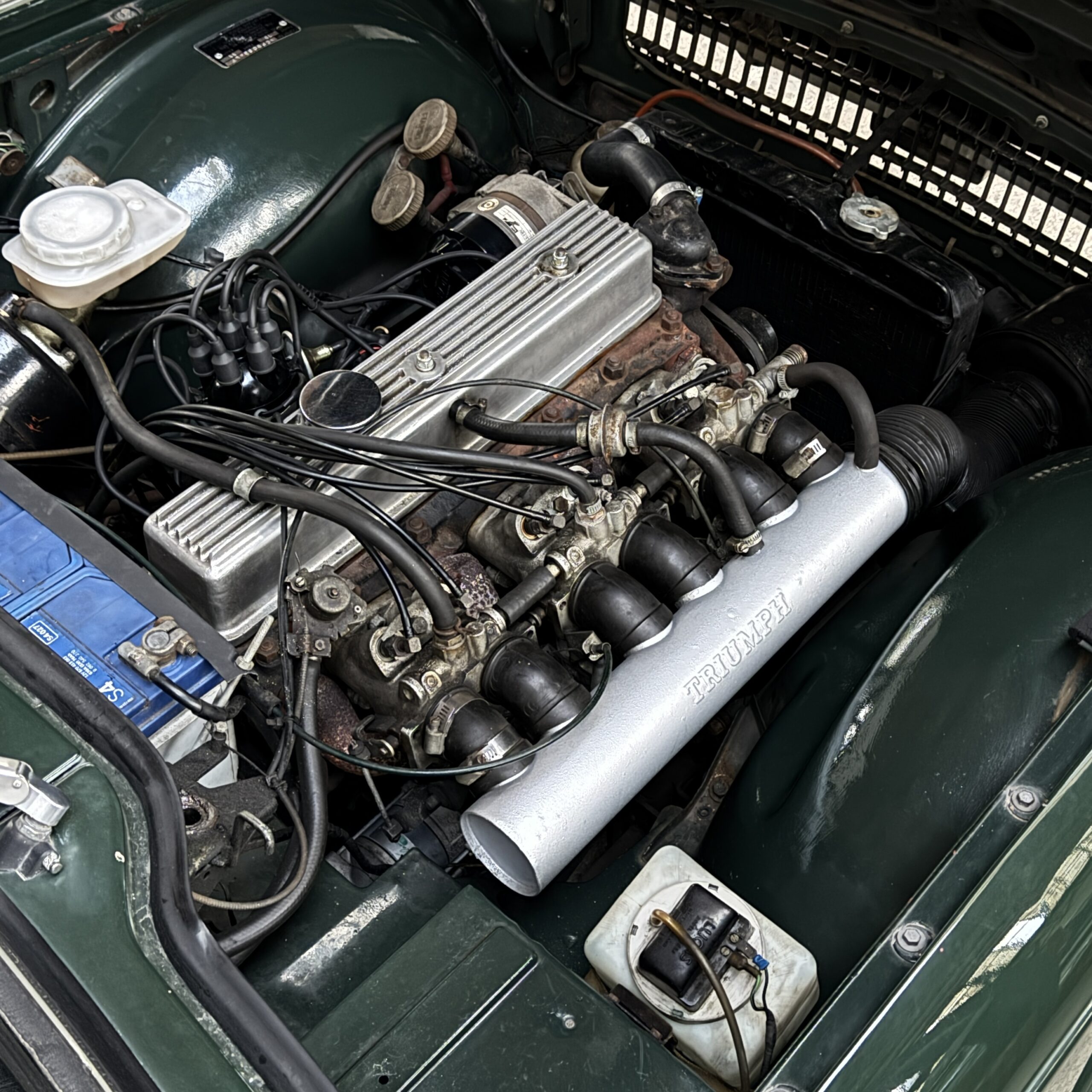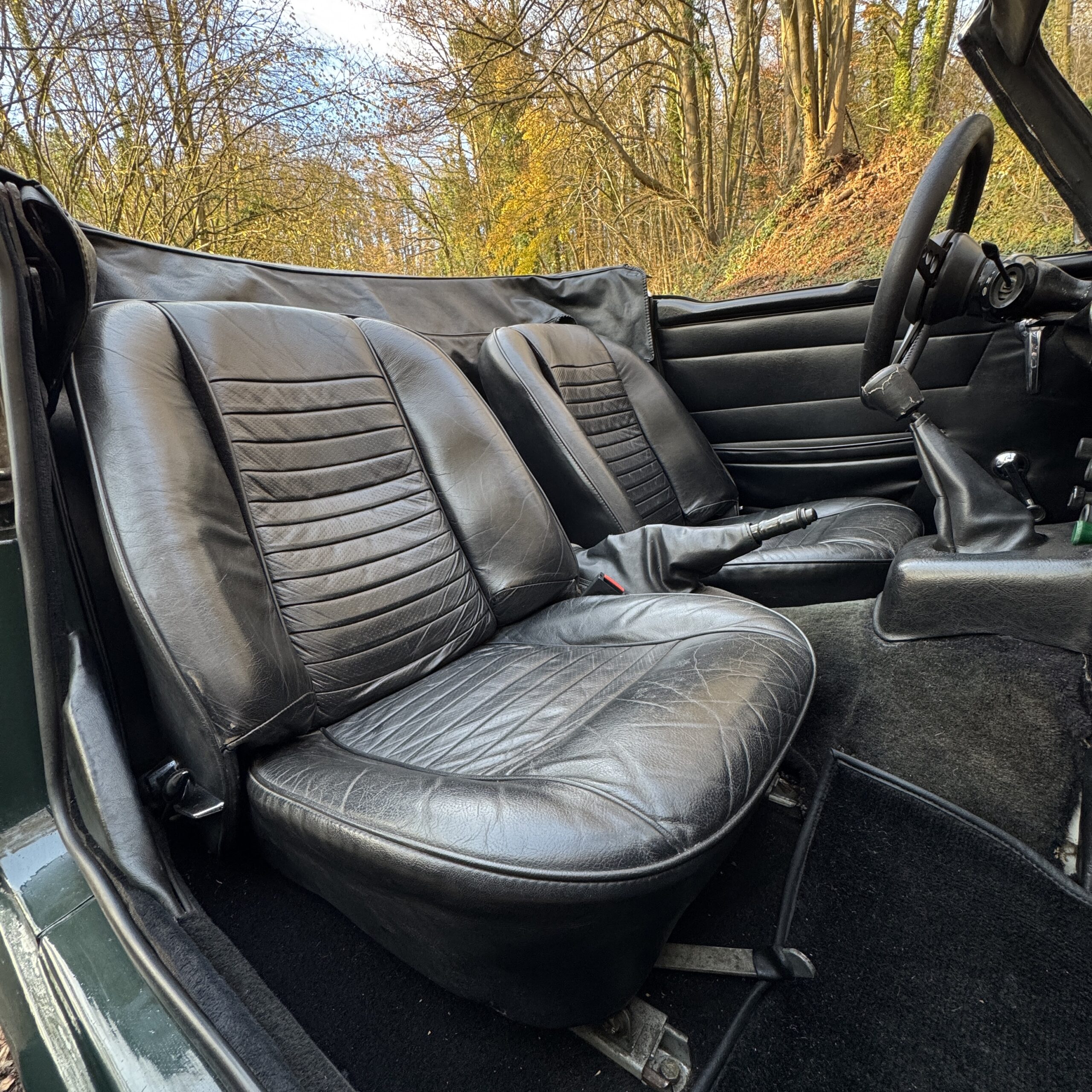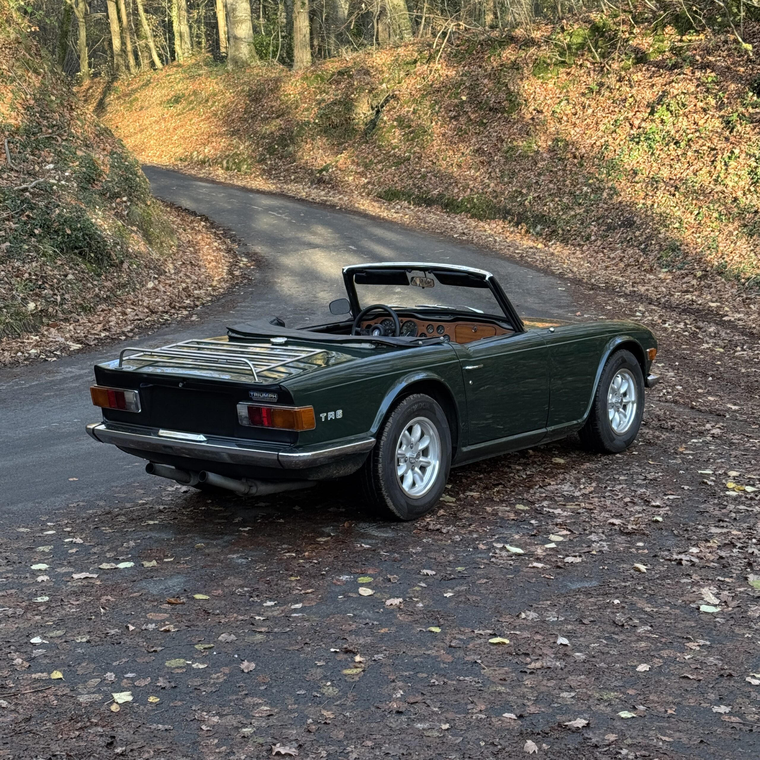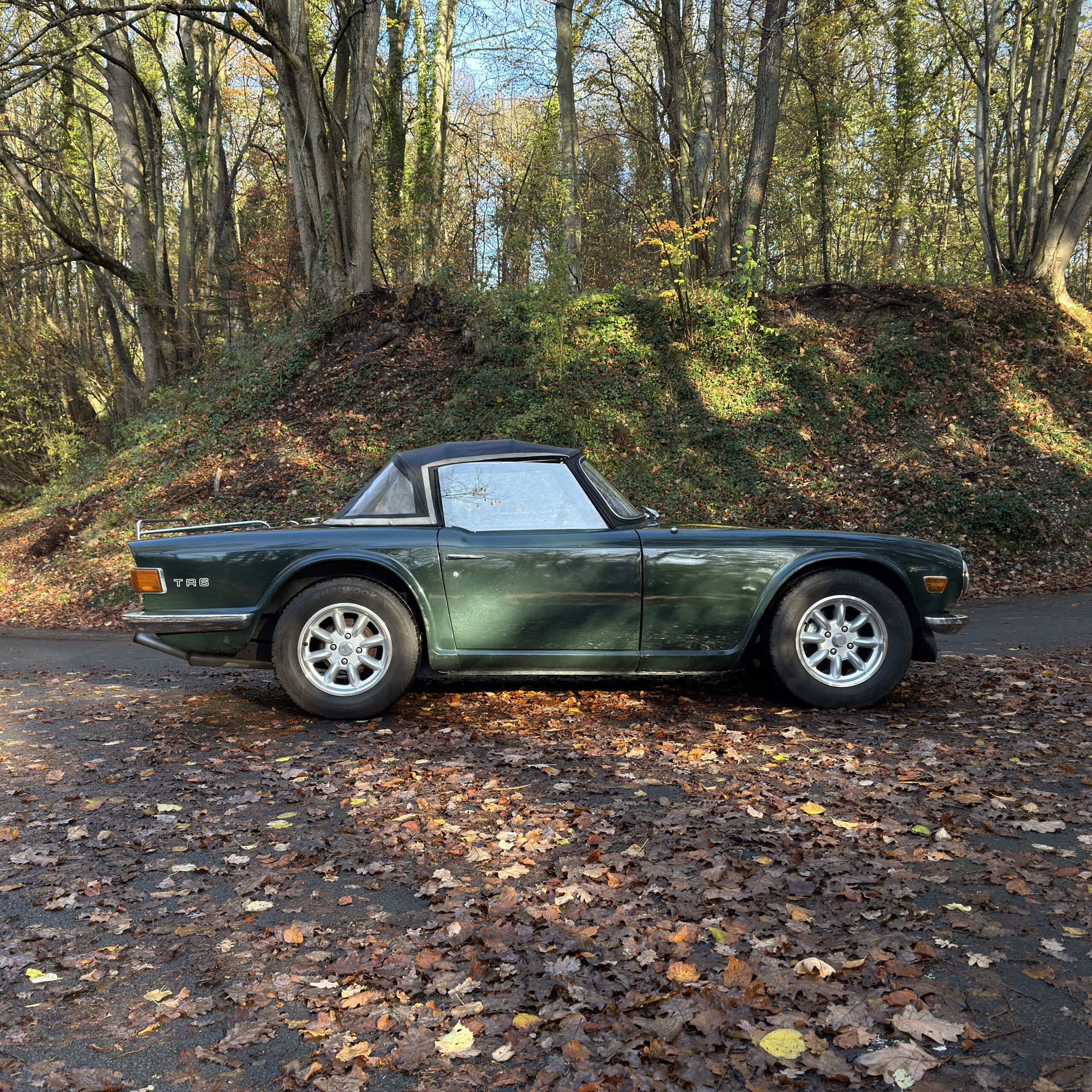 L’Atelier des 1000 a le plaisir de vous présenter aujourd’hui à la vente cette belle Triumph TR6 PI avec overdrive, dans une élégante configuration avec sa teinte British Racing Green, son intérieur en cuir noir véritable et sa capote assortie.