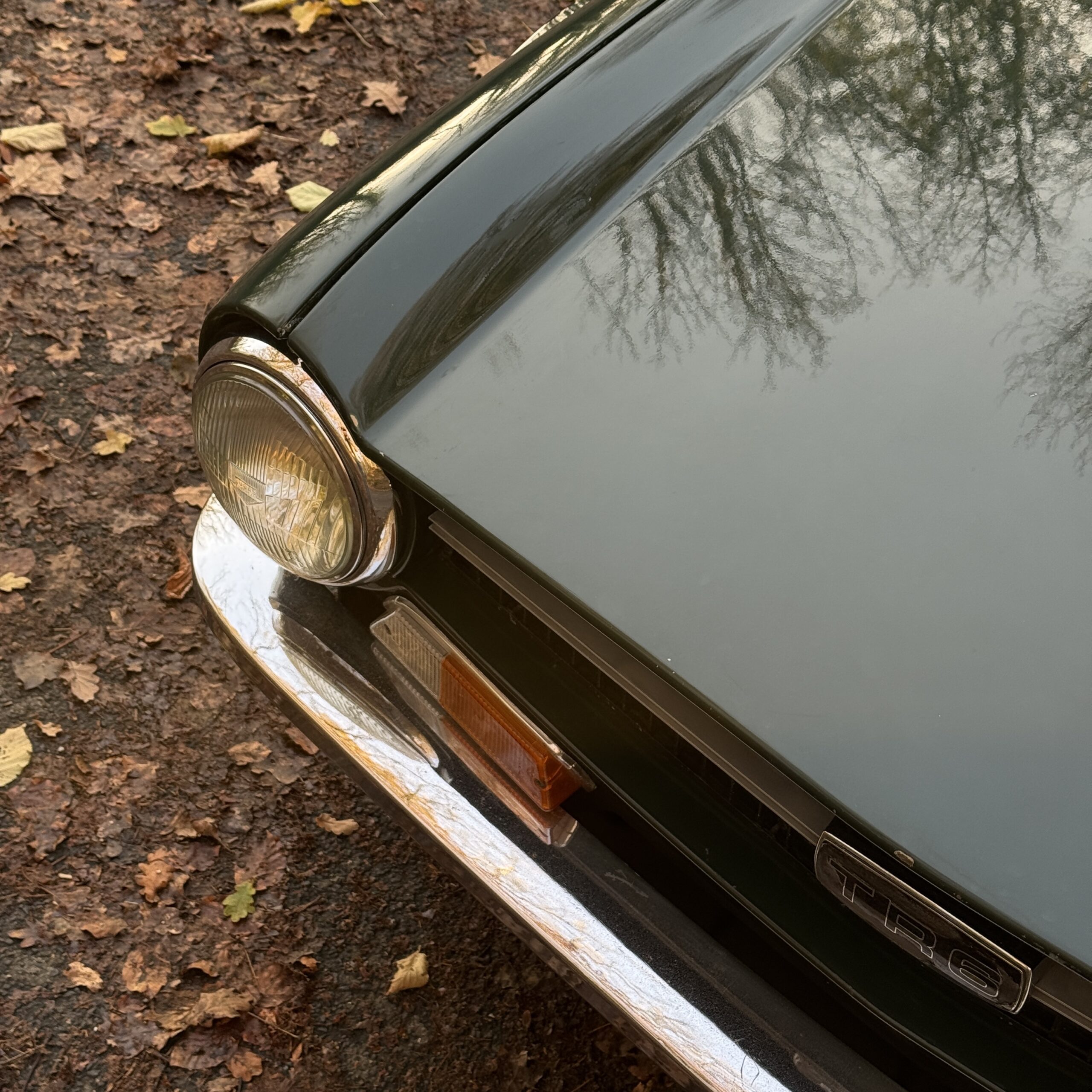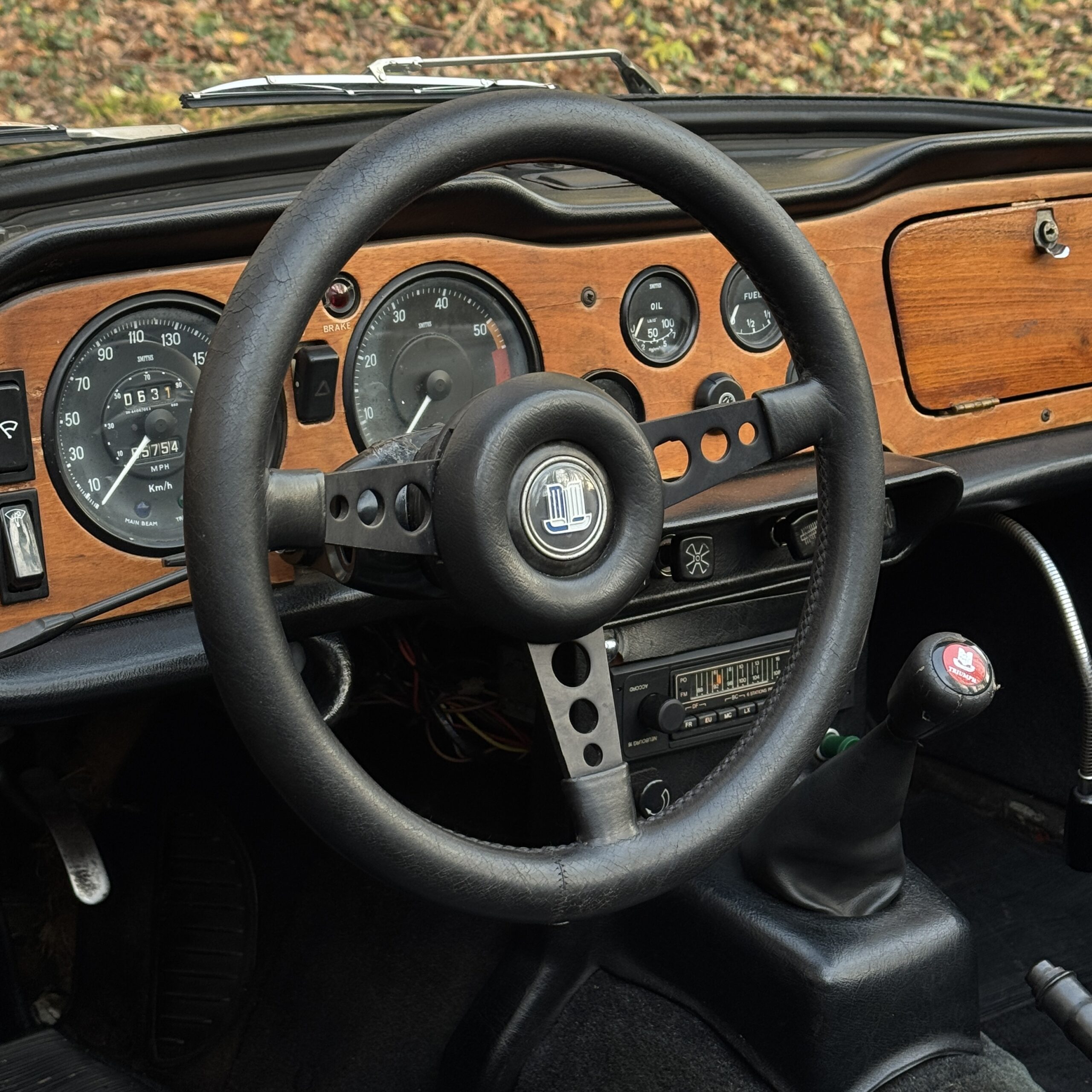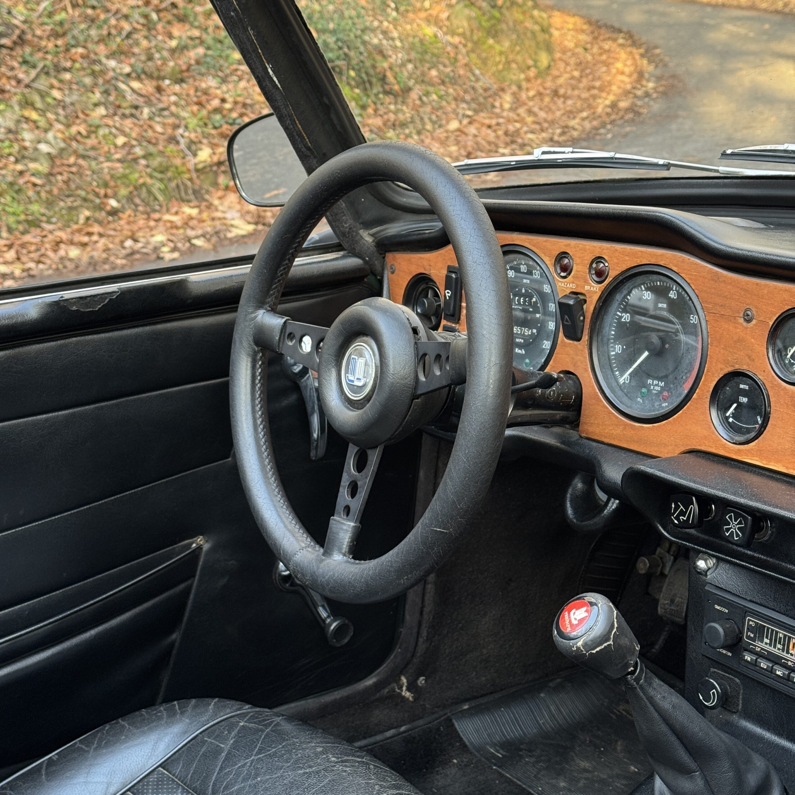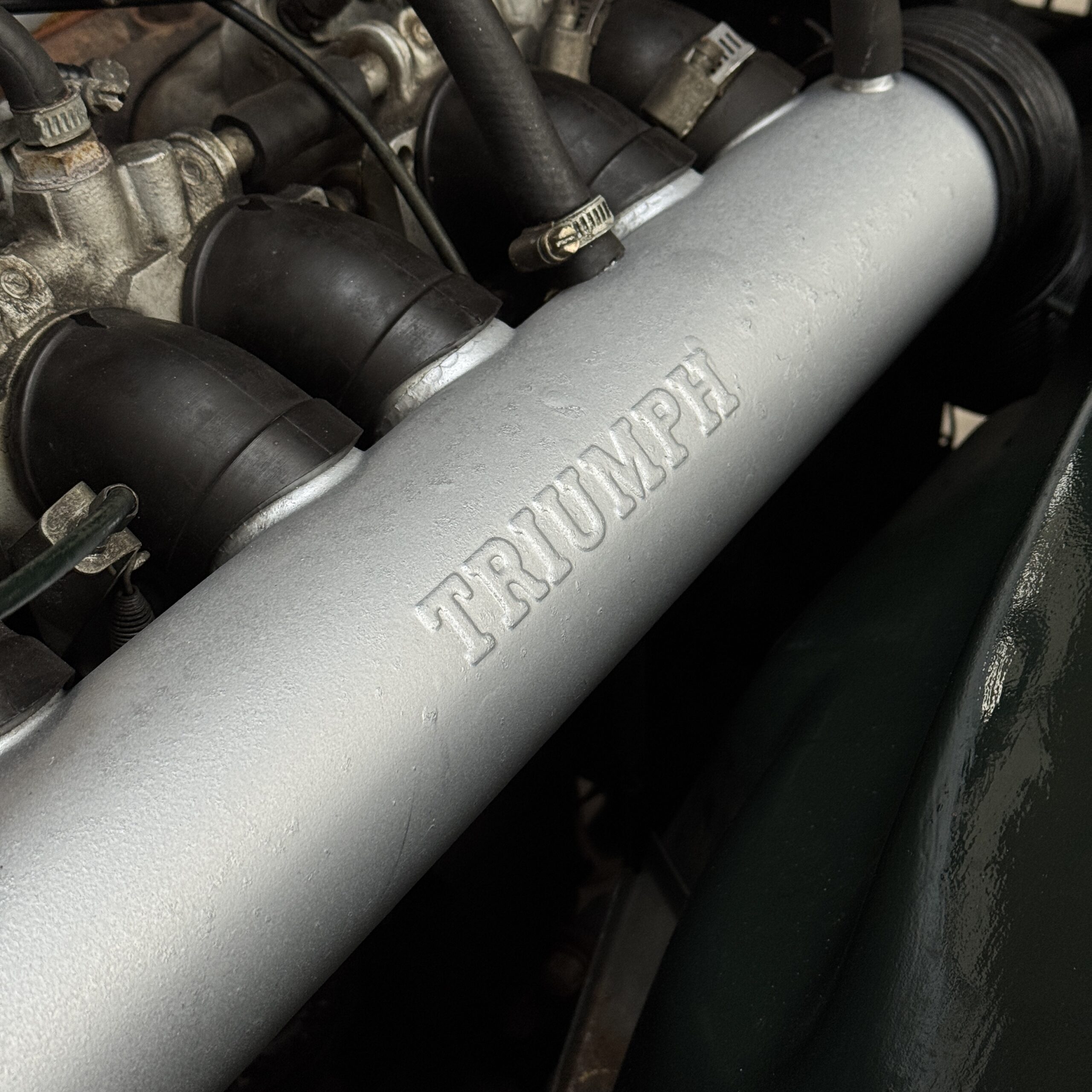 La carrosserie de cette Triumph se distingue par le fait qu’elle se présente majoritairement dans sa première peinture. Celle-ci conserve un bel éclat et arbore une patine homogène auquel nous ne sommes pas insensible.