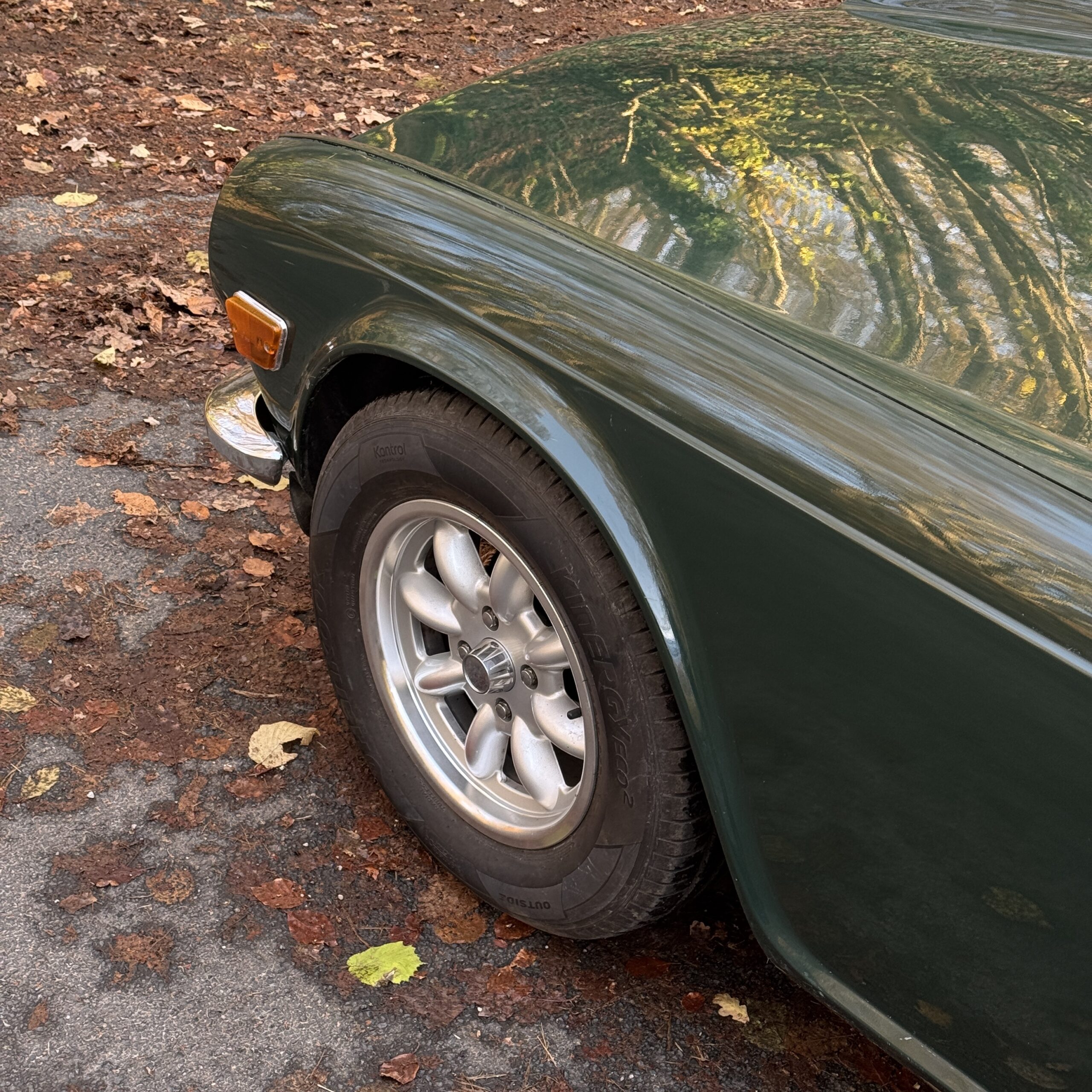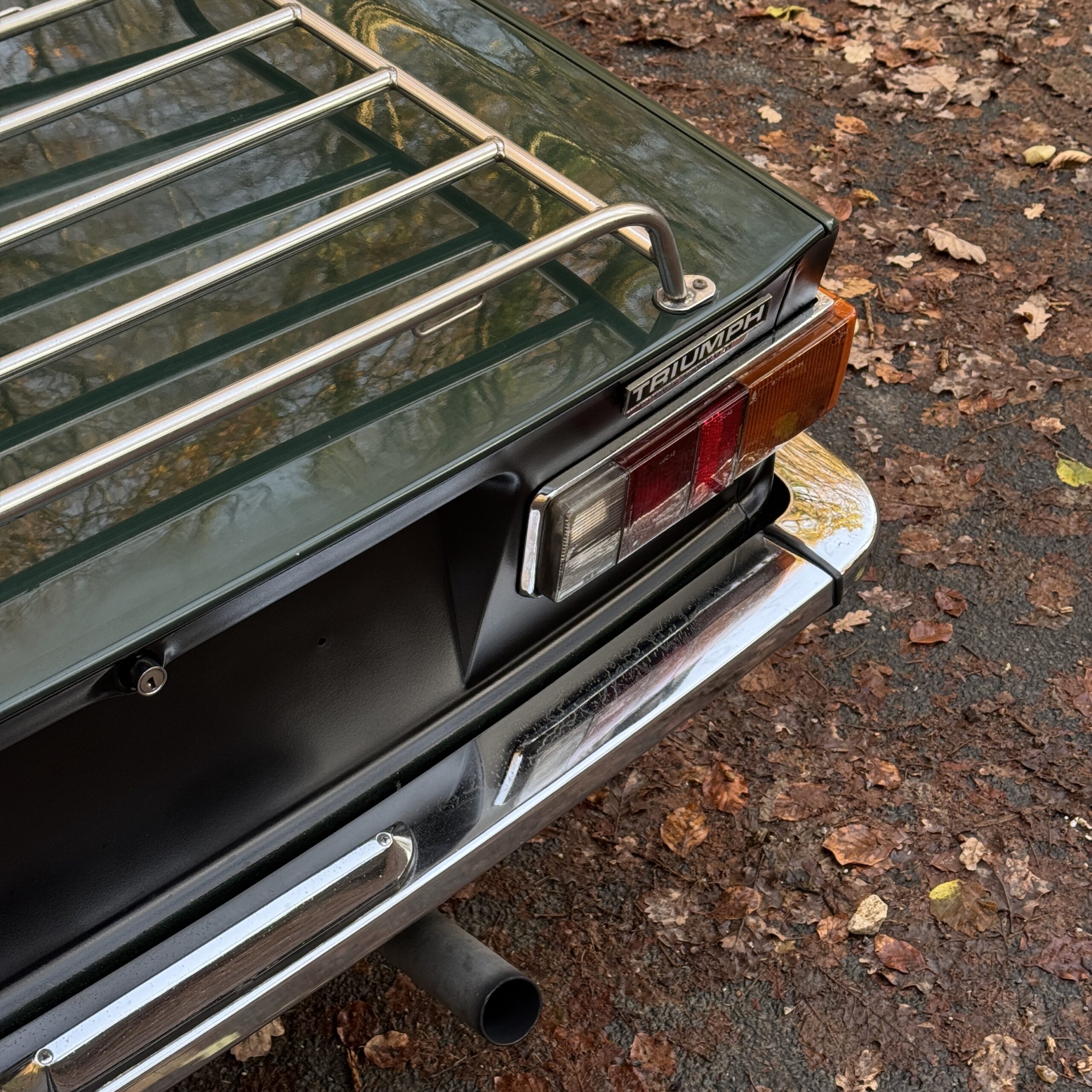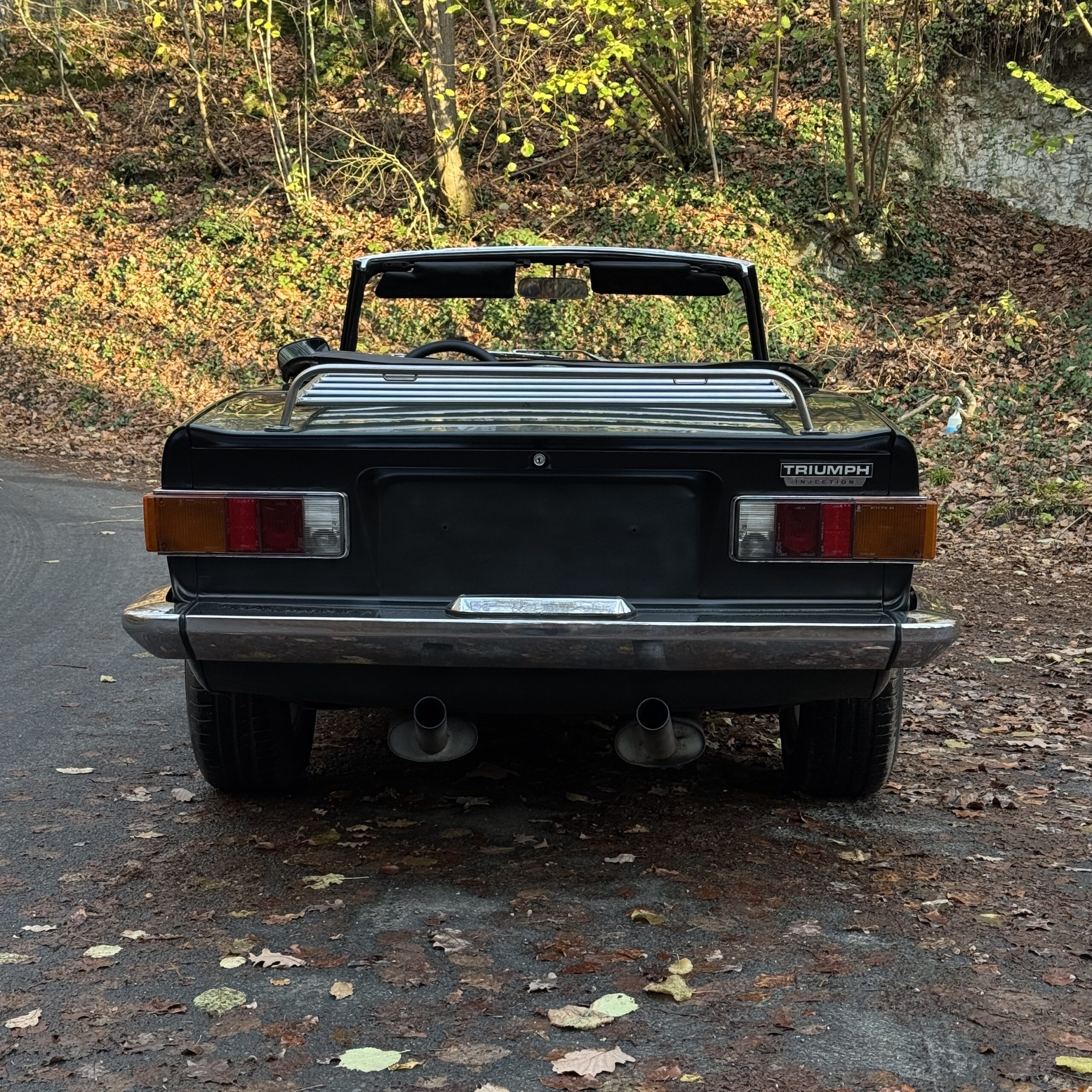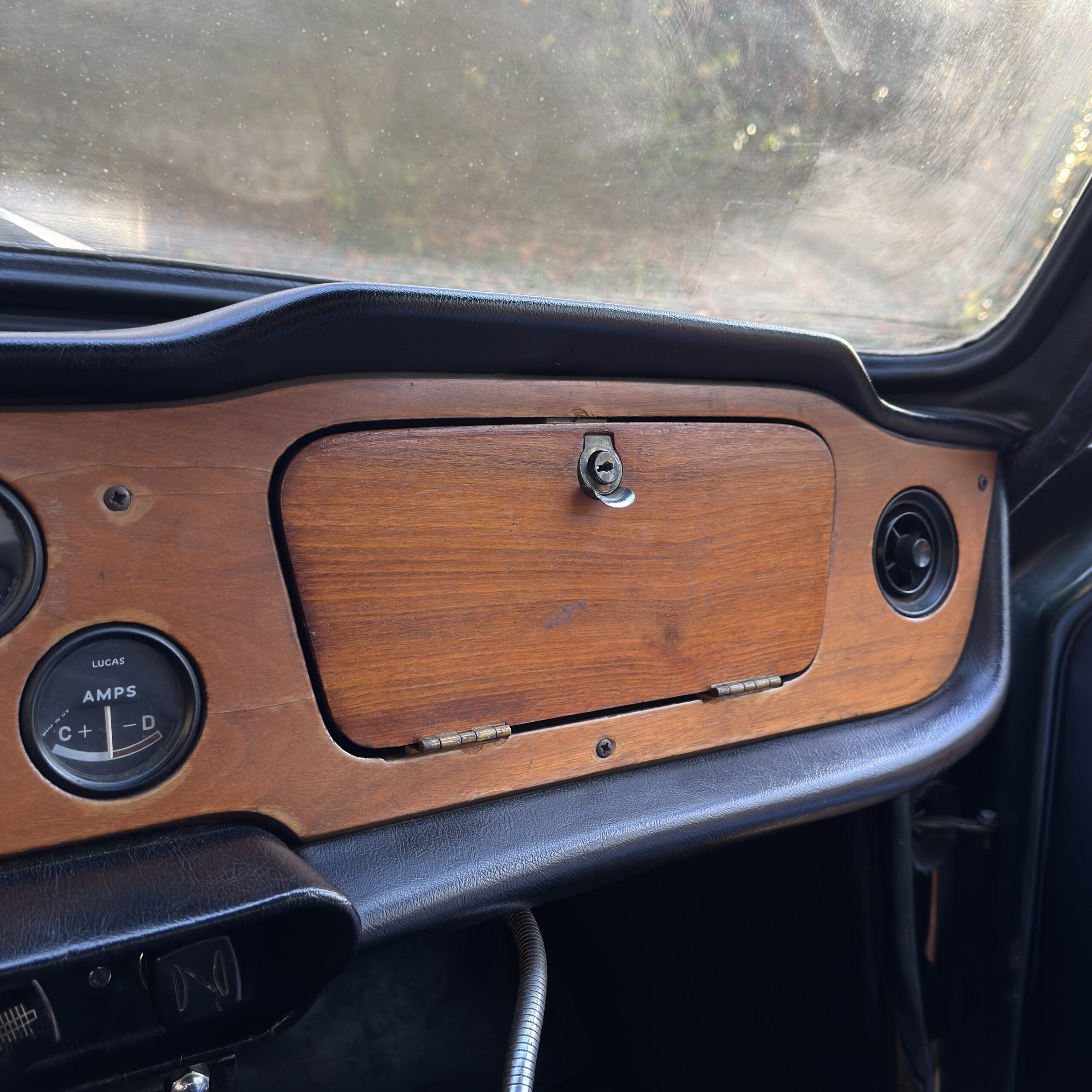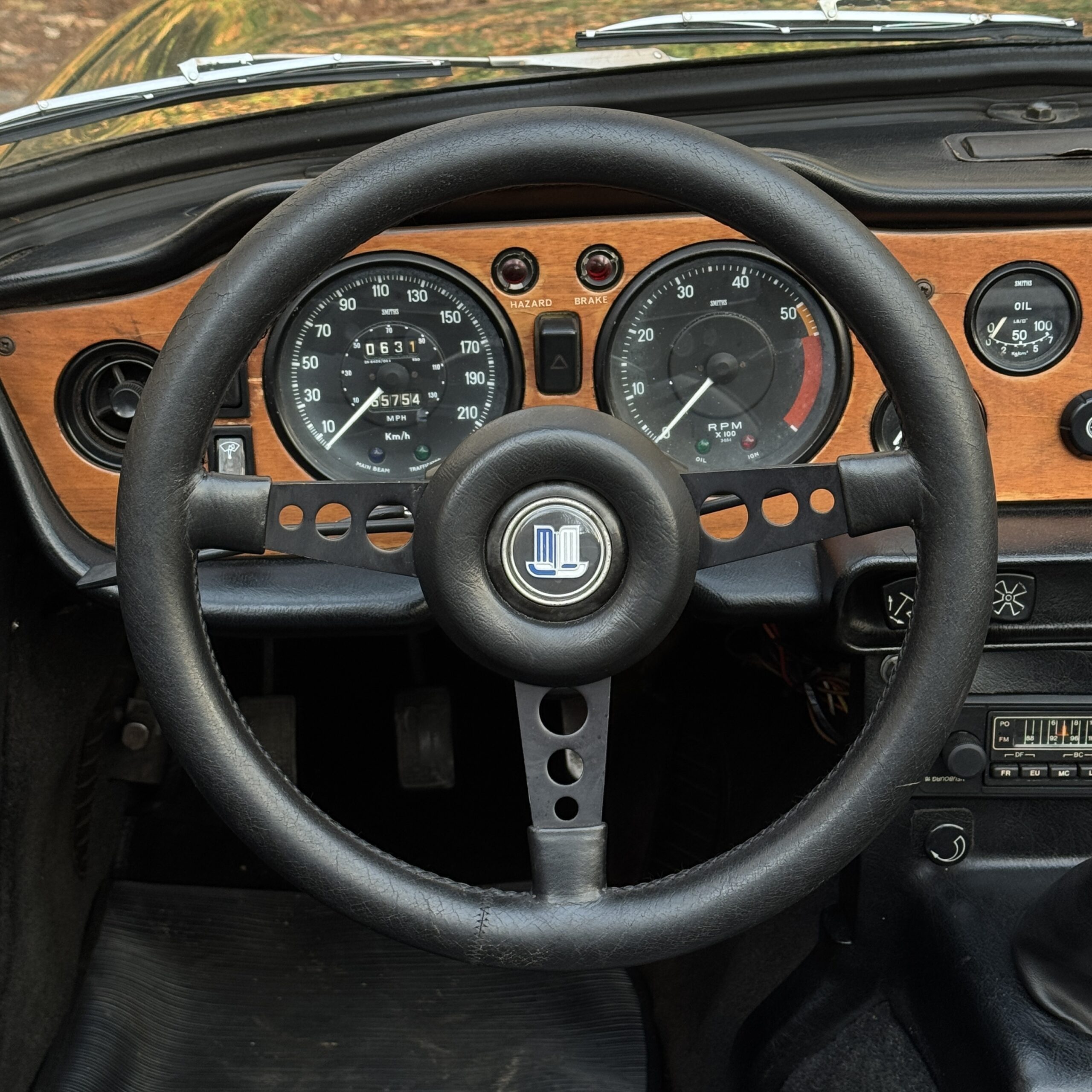 La carrosserie de cette Triumph se distingue par le fait qu’elle se présente majoritairement dans sa première peinture. Celle-ci conserve un bel éclat et arbore une patine homogène auquel nous ne sommes pas insensible.