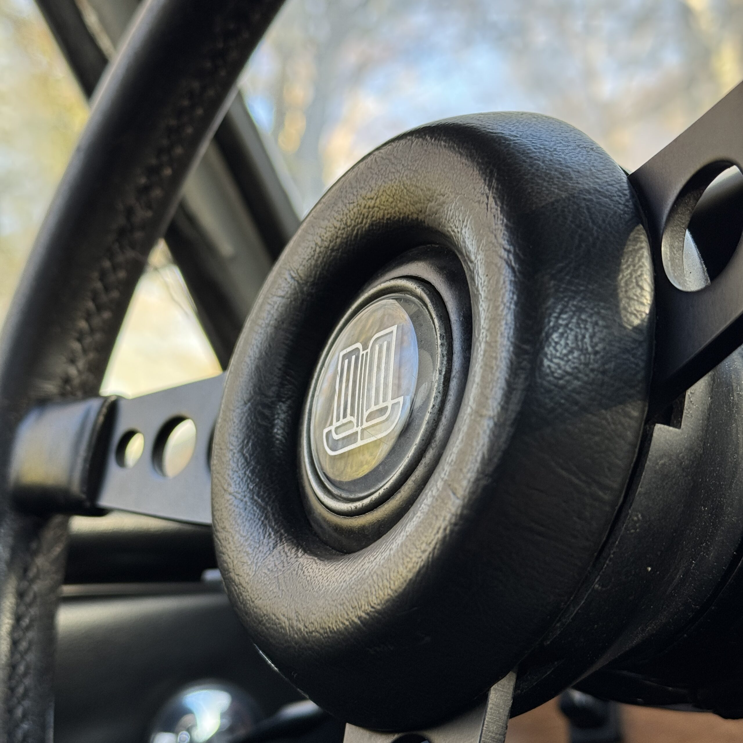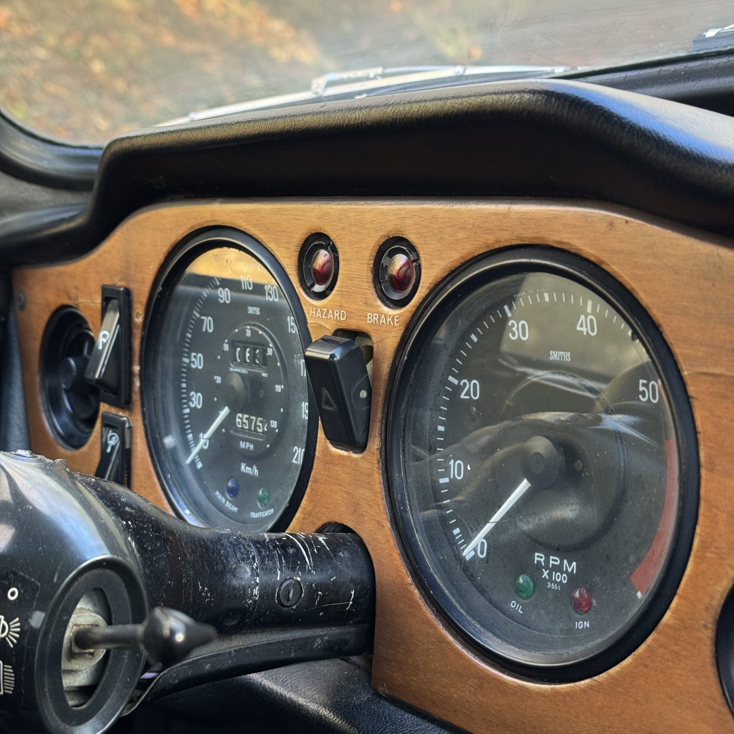 Le volant trois branches et la planche de bord en ronce de noyer sont bien conservés, et l’instrumentation est fonctionnelle.