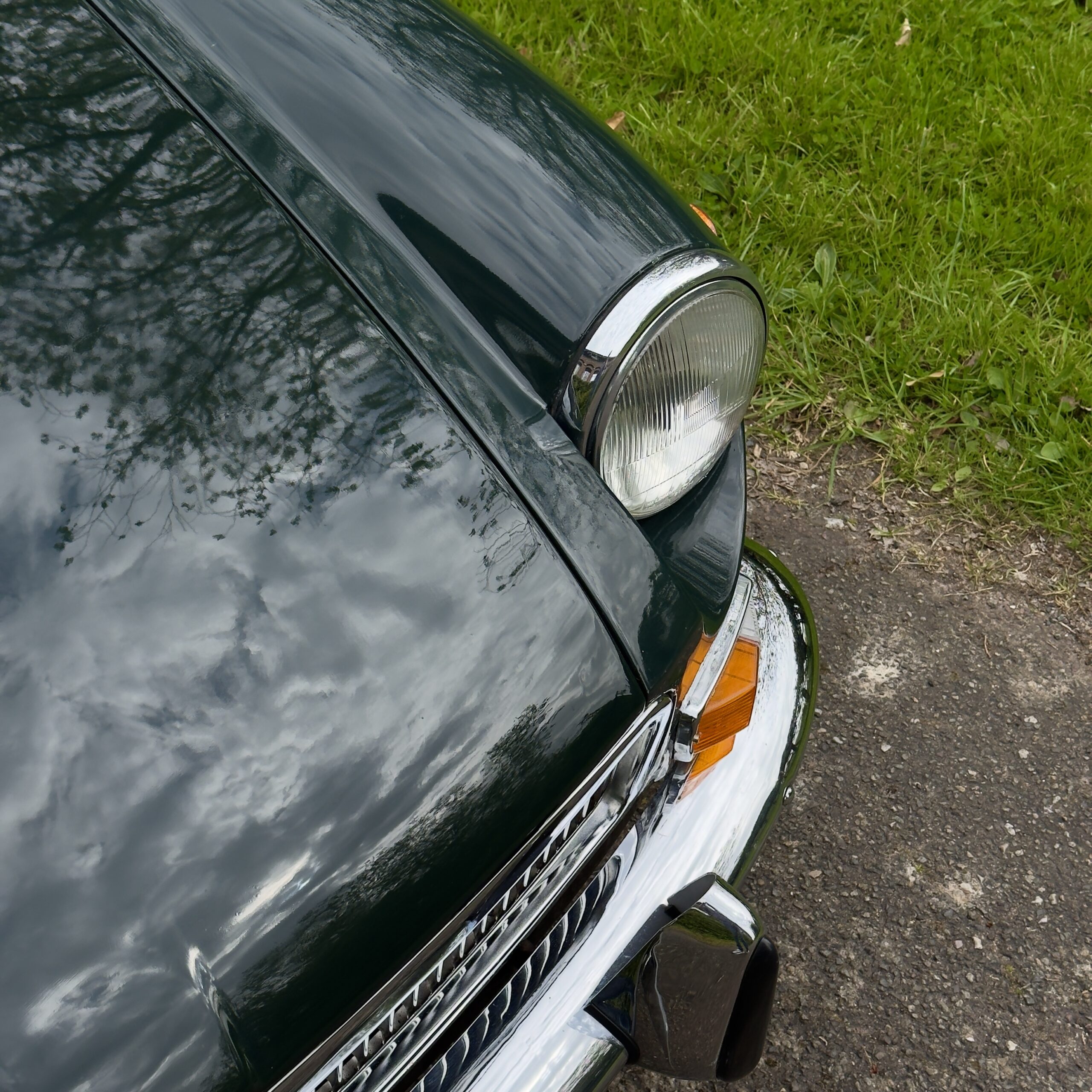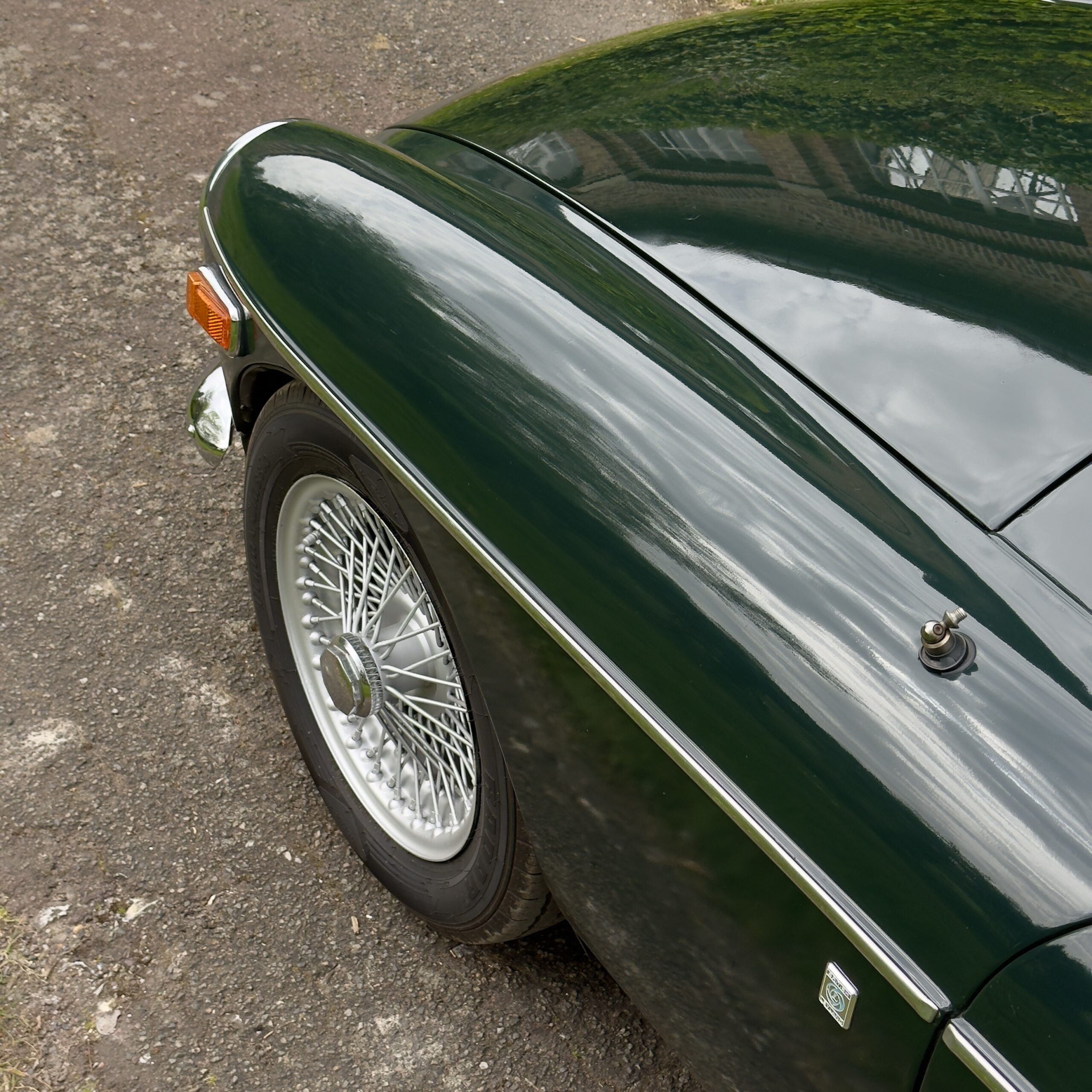 La carrosserie présente très bien, la peinture british racing green offre un bel éclat.