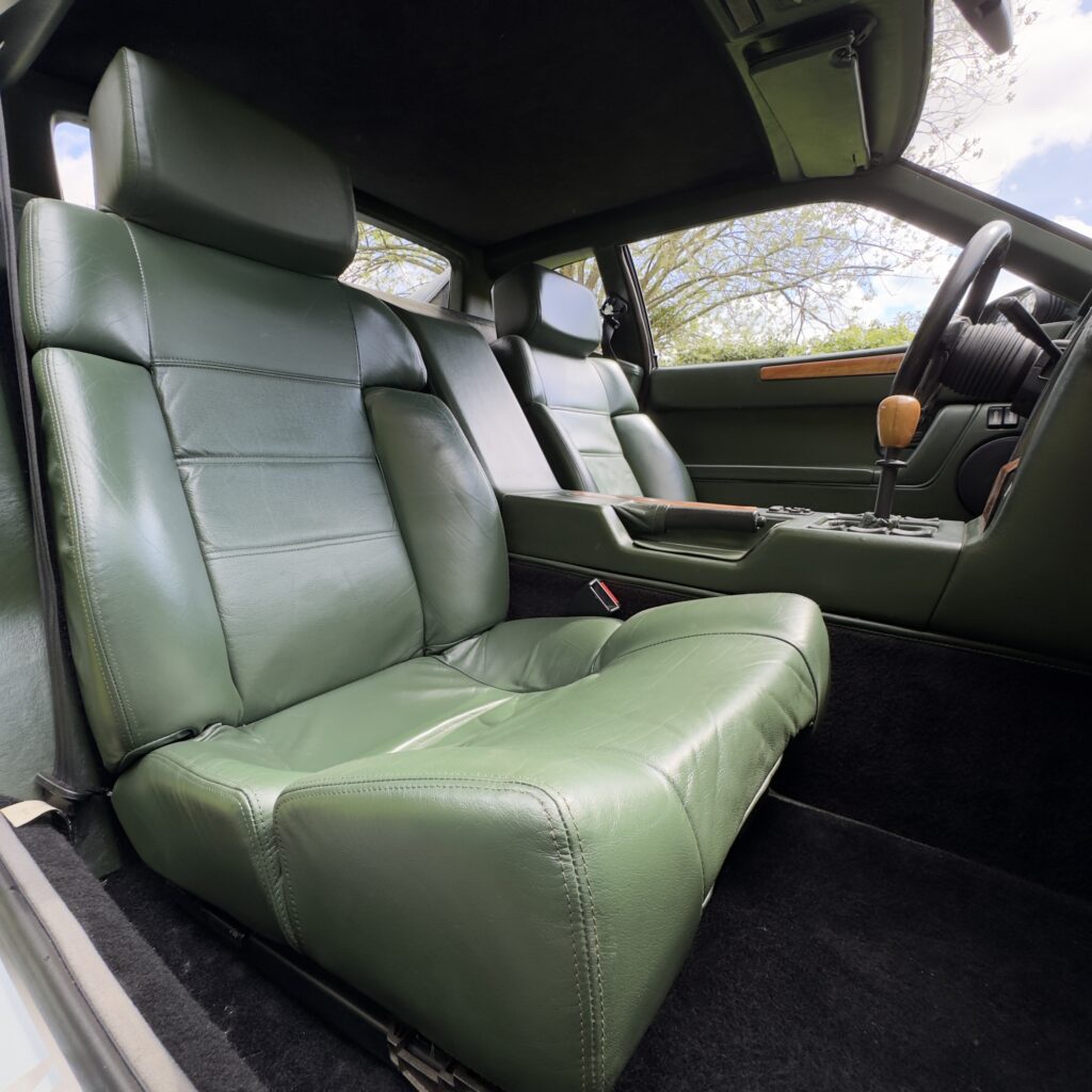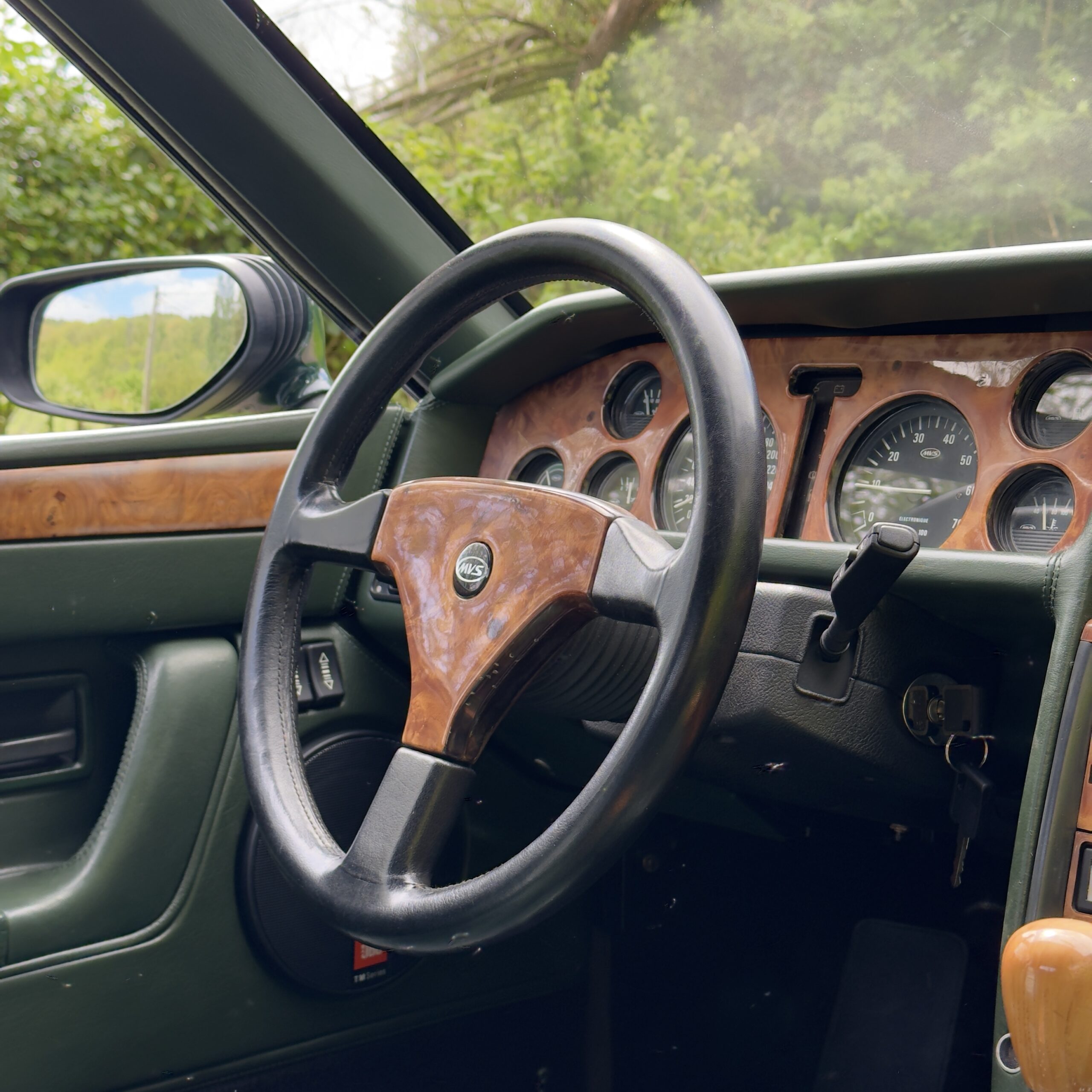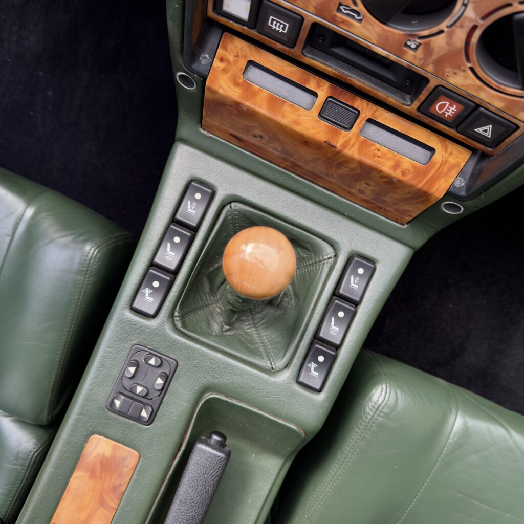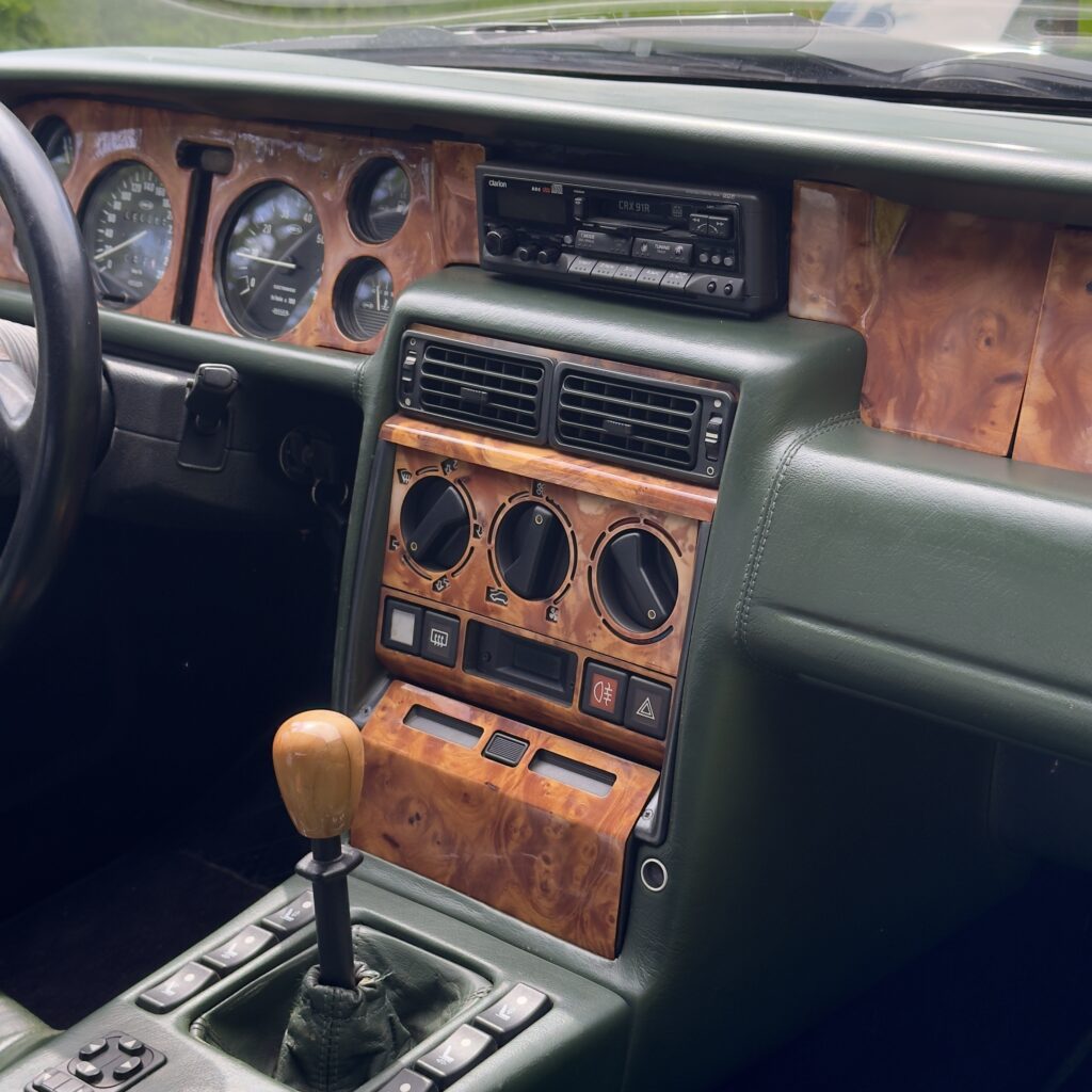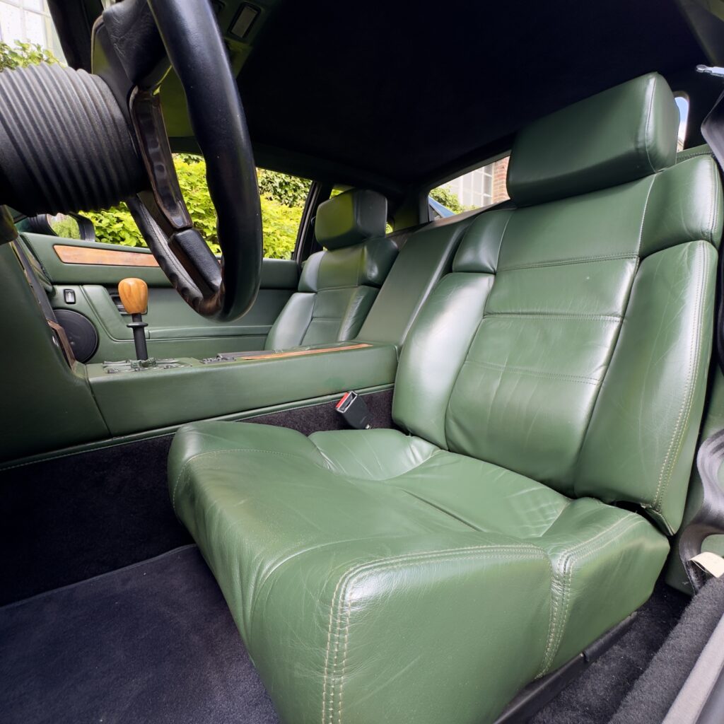 L’habitacle, typique des productions Venturi offre une ambiance unique. La sellerie en cuir connolly assortie est en très bel état, et les boiseries présentent une légère patine qui nous affectionnons particulièrement.