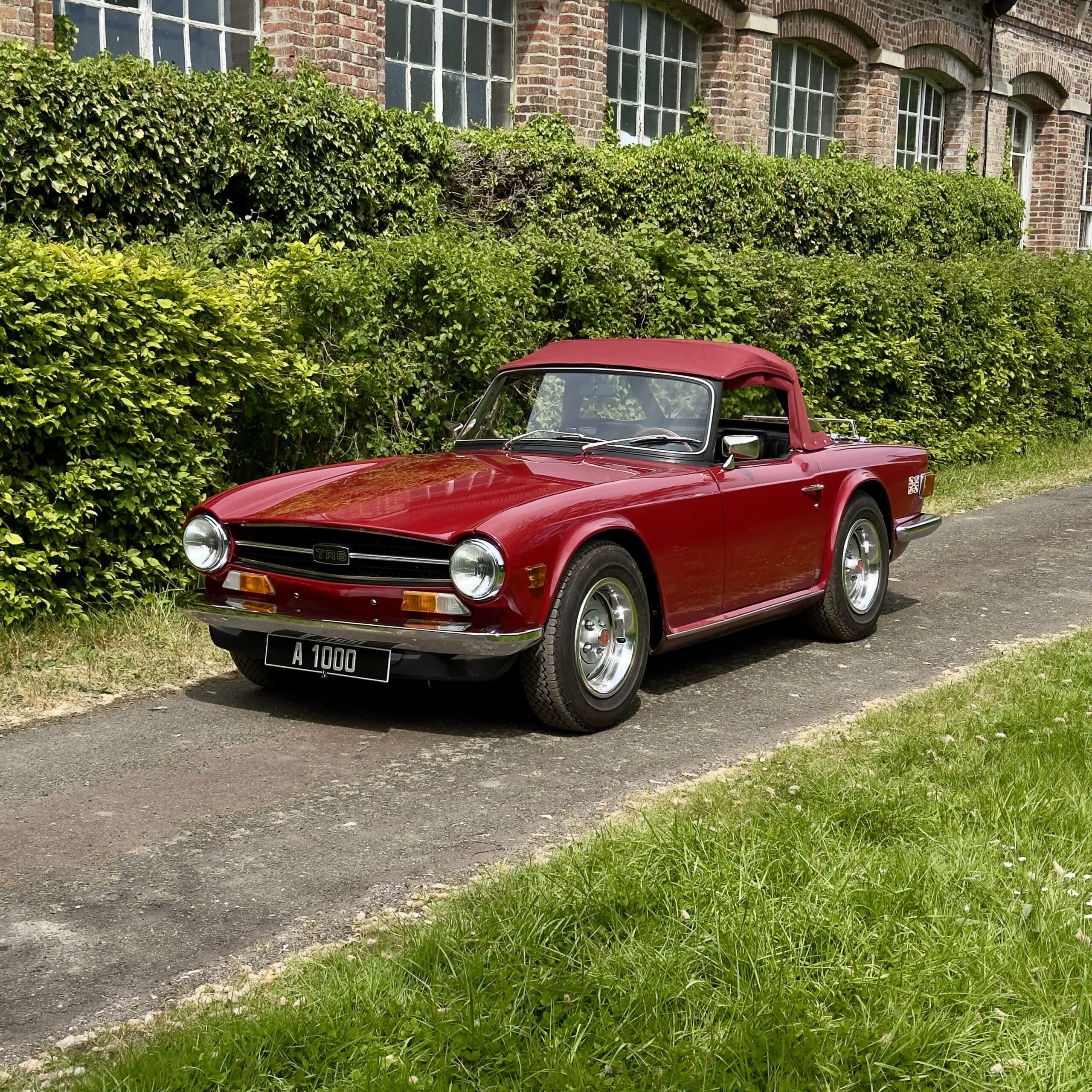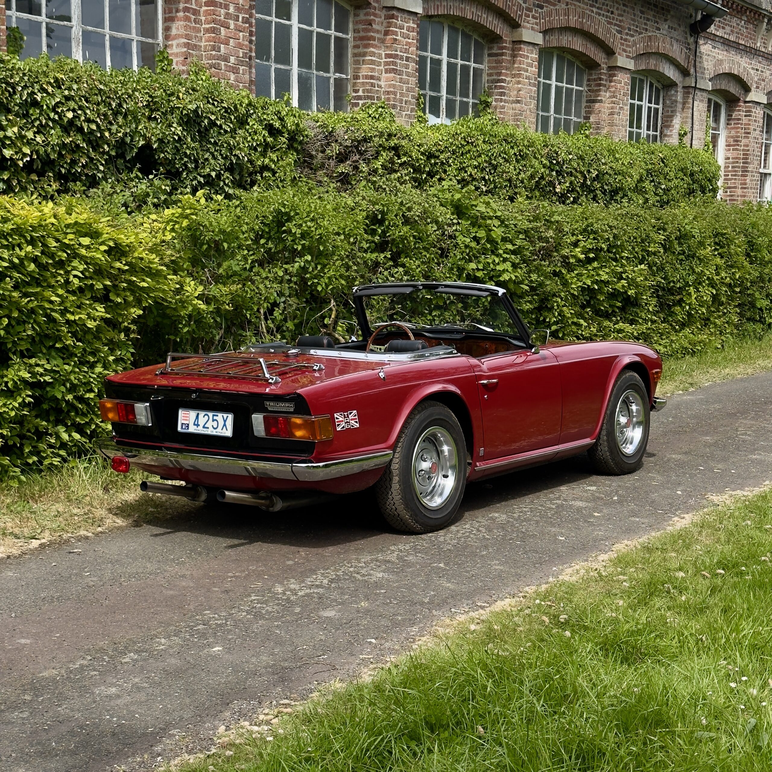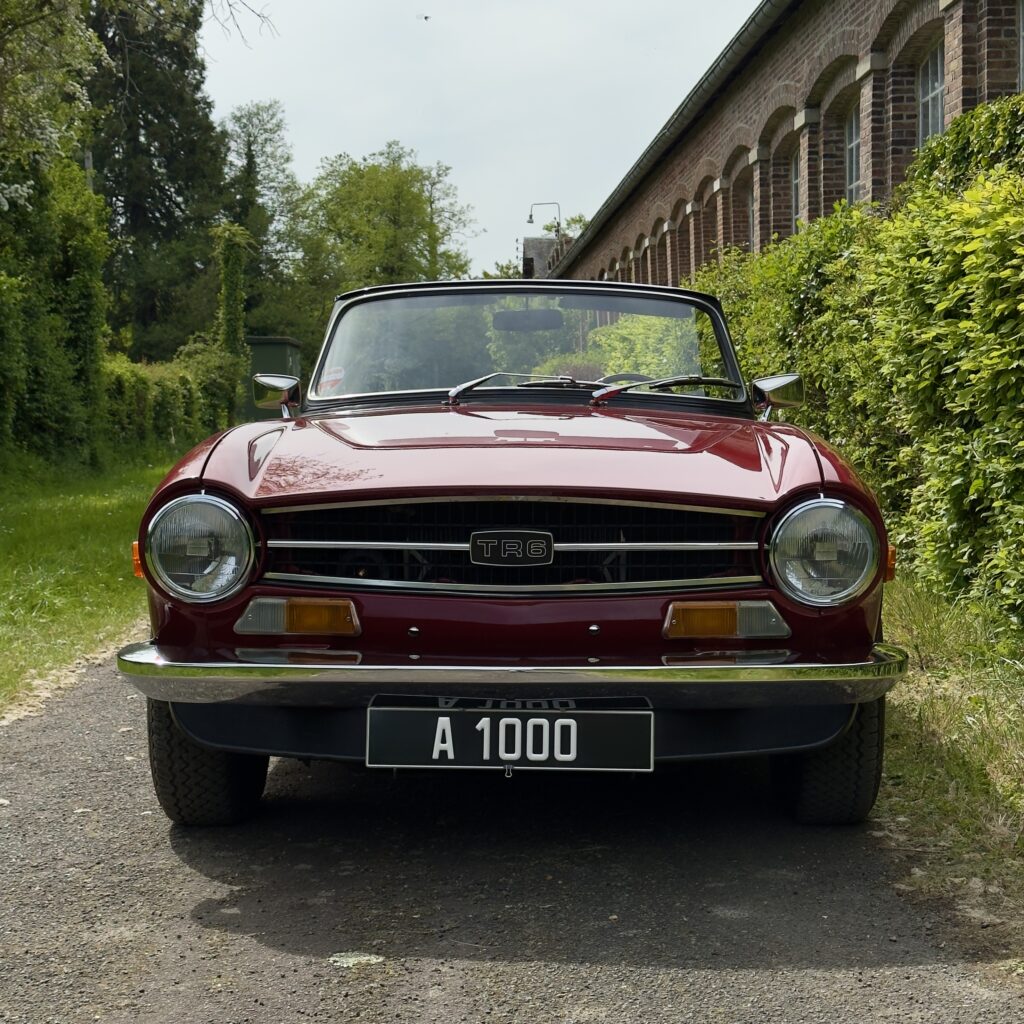 L’Atelier des 1000 a le plaisir de vous présenter aujourd’hui à la vente cette belle Triumph TR6 PI avec overdrive, dans une élégante configuration associant sa teinte bordeaux à un intérieur en cuir noir véritable, complété par une capote assortie.