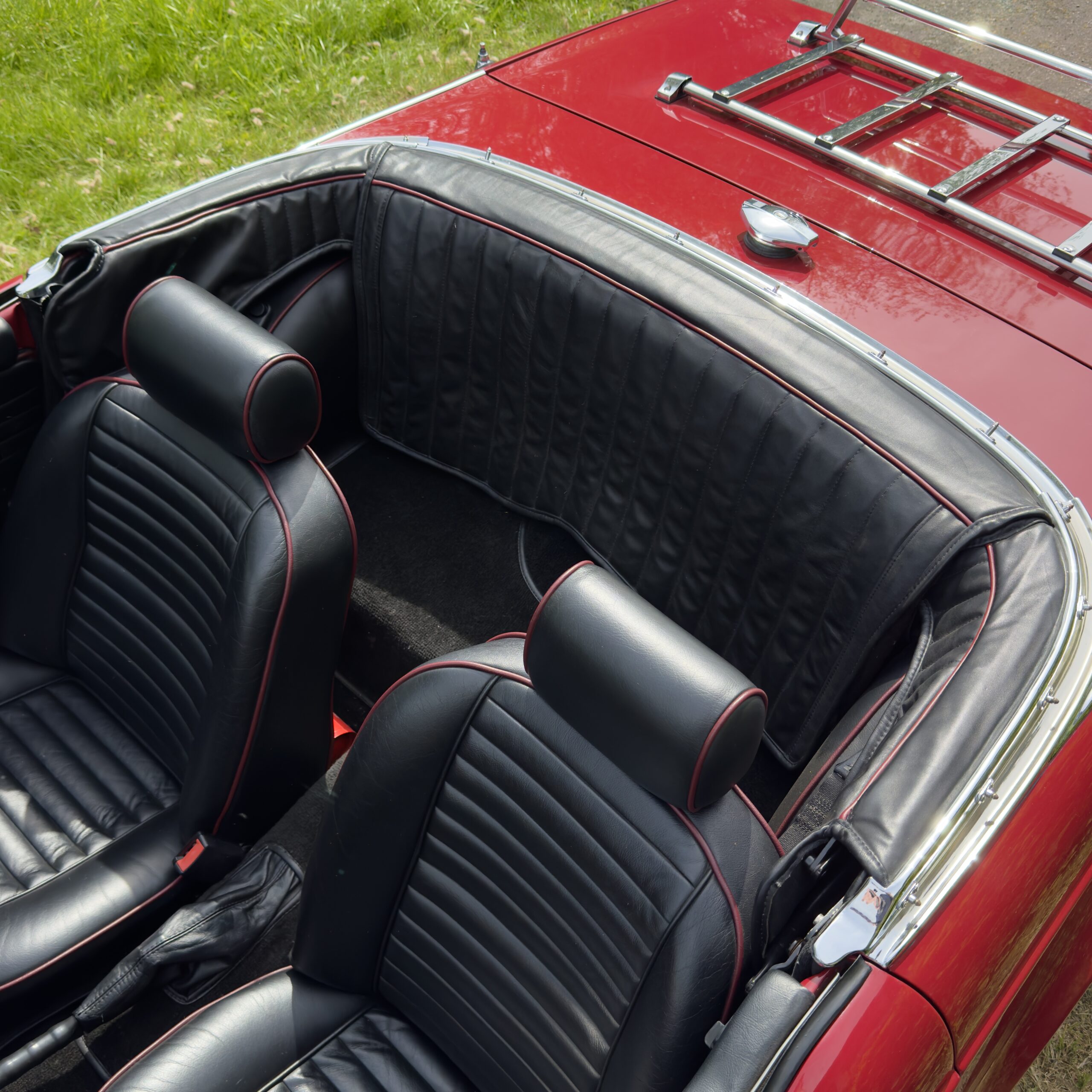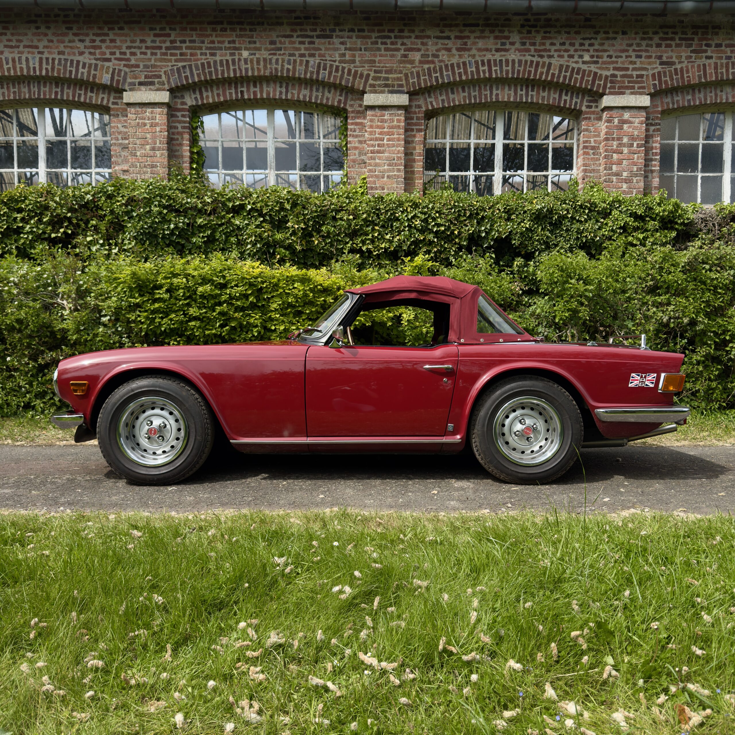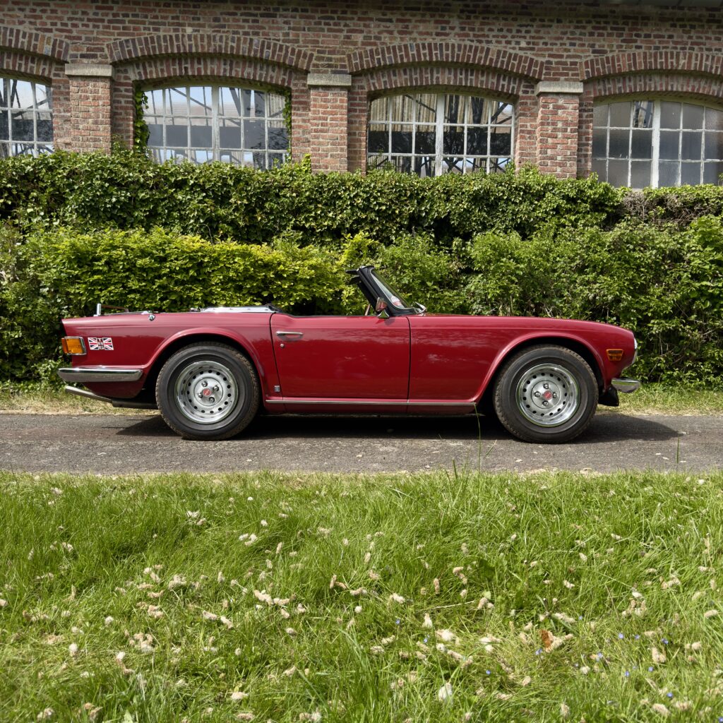 L’Atelier des 1000 a le plaisir de vous présenter aujourd’hui à la vente cette belle Triumph TR6 PI avec overdrive, dans une élégante configuration associant sa teinte bordeaux à un intérieur en cuir noir véritable, complété par une capote assortie.