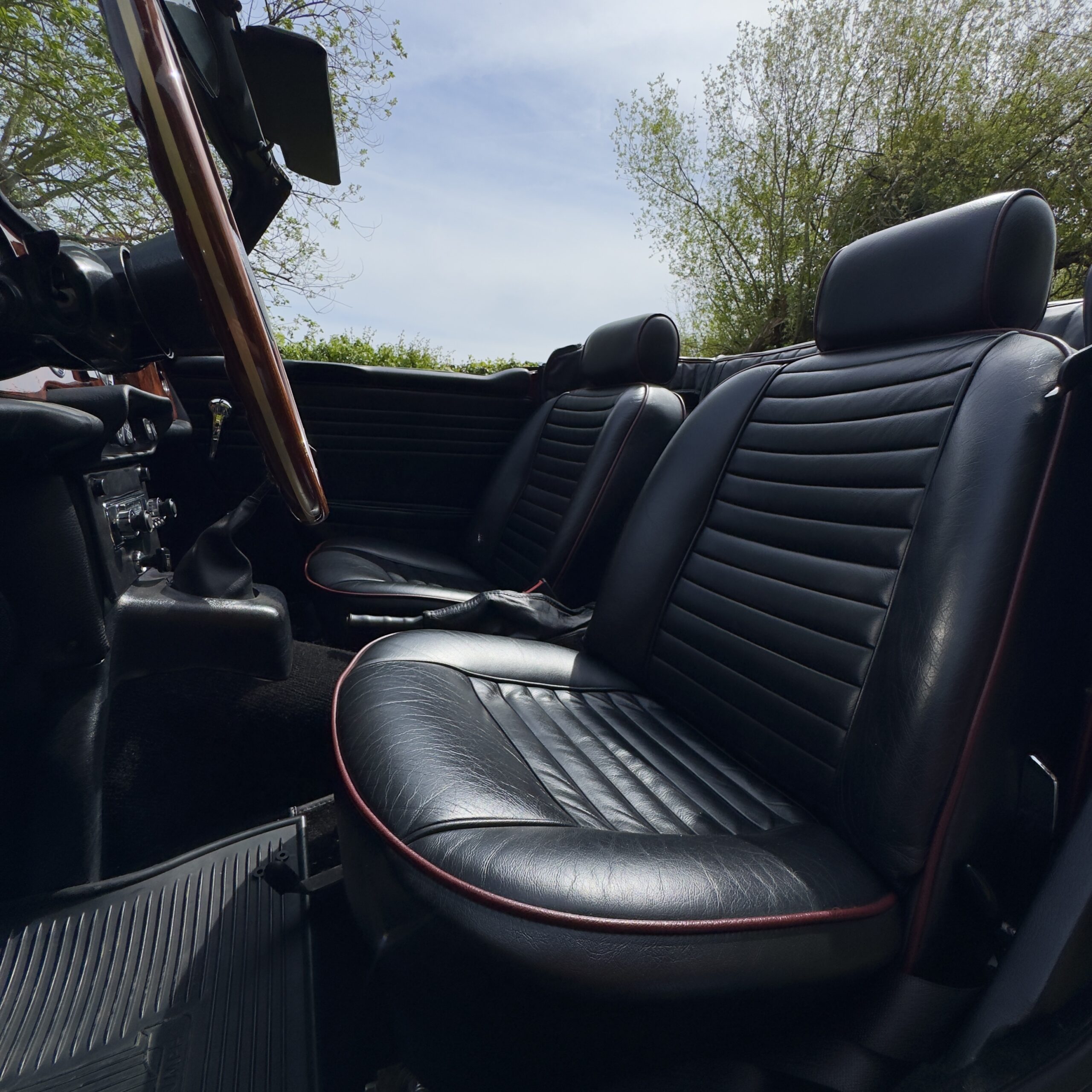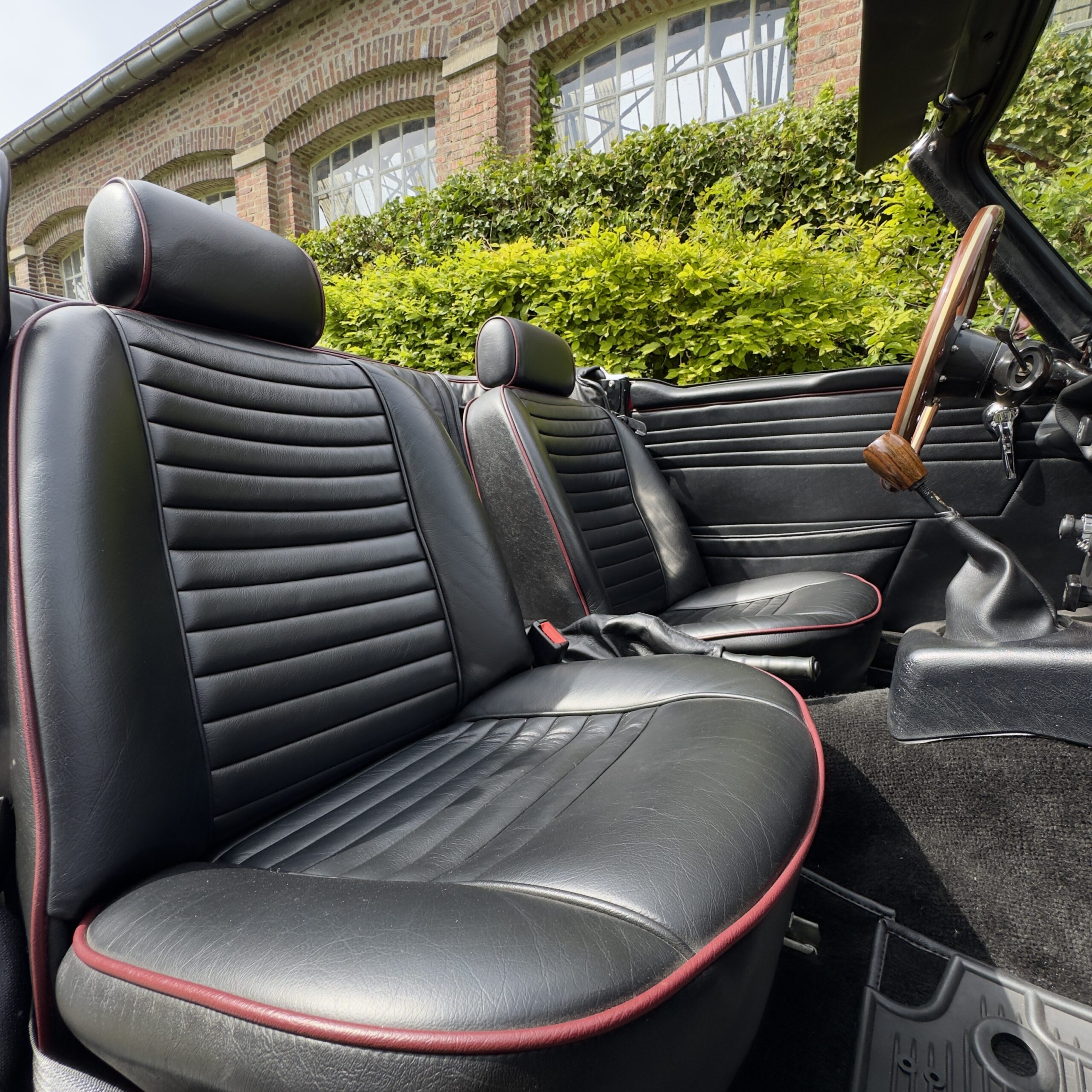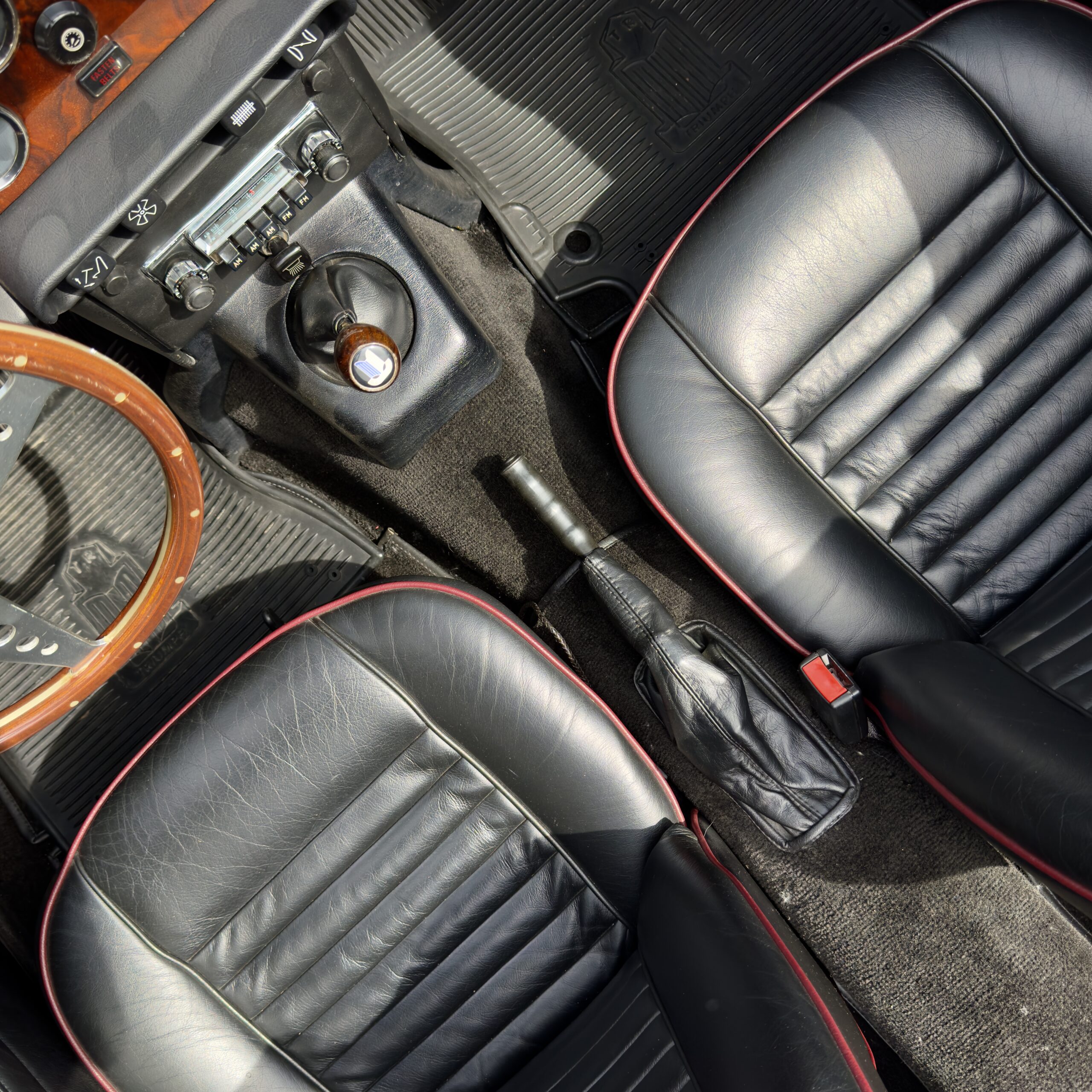 La sellerie en cuir véritable est en très bel état. La combinaison du cuir noir et des passepoils bordeaux s’accorde à merveille avec la teinte de la carrosserie.